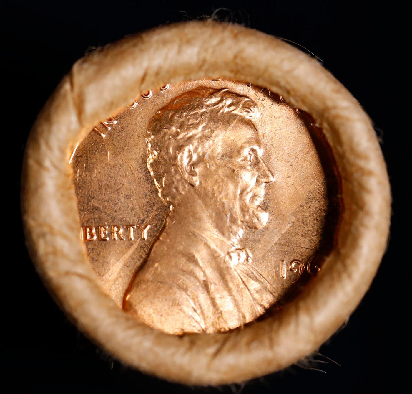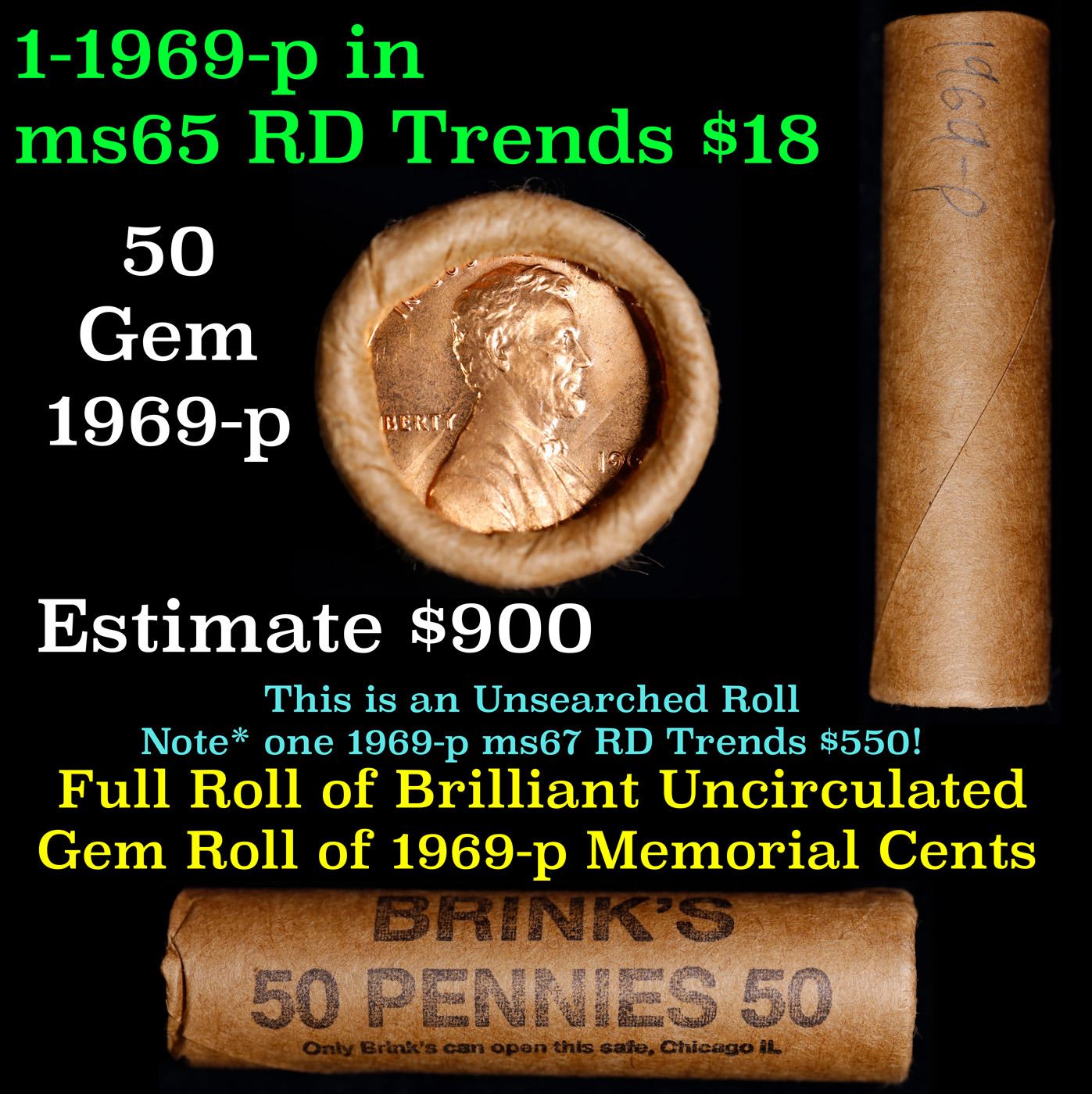Shotgun Lincoln 1c roll, 1969-p 50 pcs Brandt Wrapper . A terrific Shotgun roll of Lincoln cents. All coins cherry red. Trends ms65 rd $18