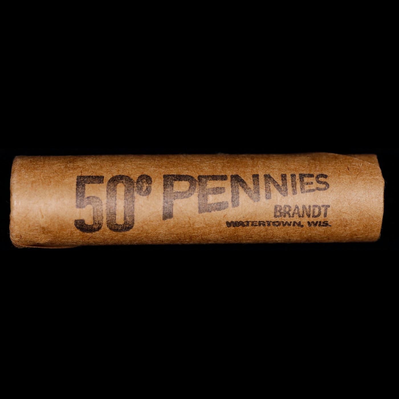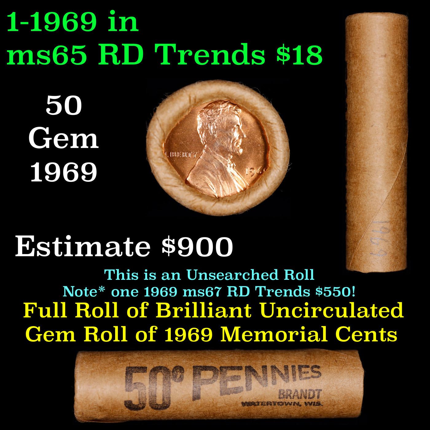 Shotgun Lincoln 1c roll, 1969-p 50 pcs Brandt Wrapper . A terrific Shotgun roll of Lincoln cents. All coins appear to be cherry red. Trends ms65 rd $18