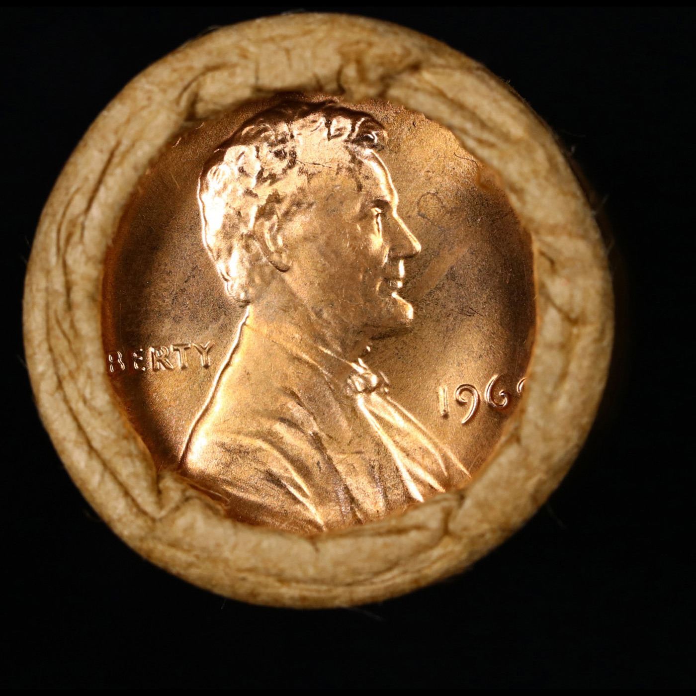 Shotgun Lincoln 1c roll, 1969-p 50 pcs Brandt Wrapper.. A terrific Shotgun roll of Lincoln cents. Most if not all coin should be cherry red.