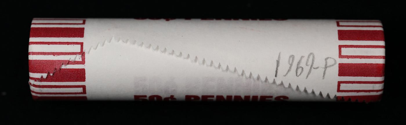 Shotgun Lincoln 1c roll, 1969-p 50 pcs Steel-Strong Wrapper.. A terrific Shotgun roll of Lincoln cents. Most if not all coin should be cherry red.