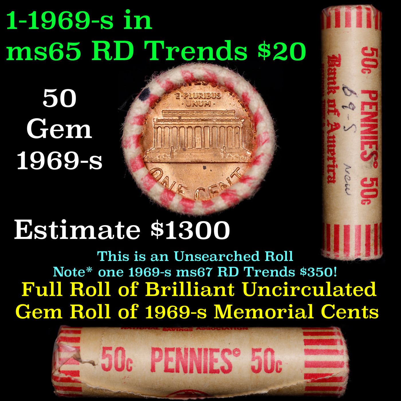 Shotgun Lincoln 1c roll, 1969-s 50 pcs Bank of America Wrapper . A terrific Shotgun roll of Lincoln cents. All coins appear to be cherry red. Trends ms65 rd $20