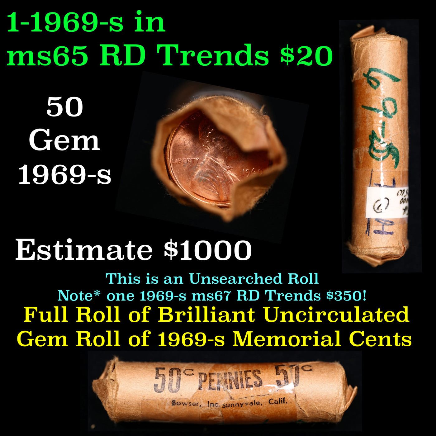 Shotgun Lincoln 1c roll, 1969-s 50 pcs Bowser Wrapper.. A terrific Shotgun roll of Lincoln cents. Most if not all coin should be cherry red.