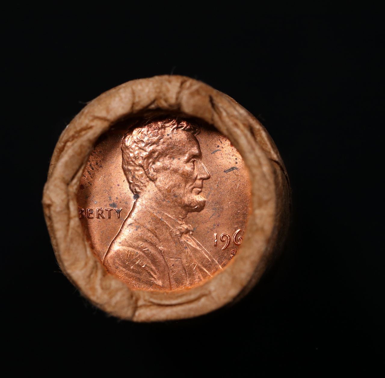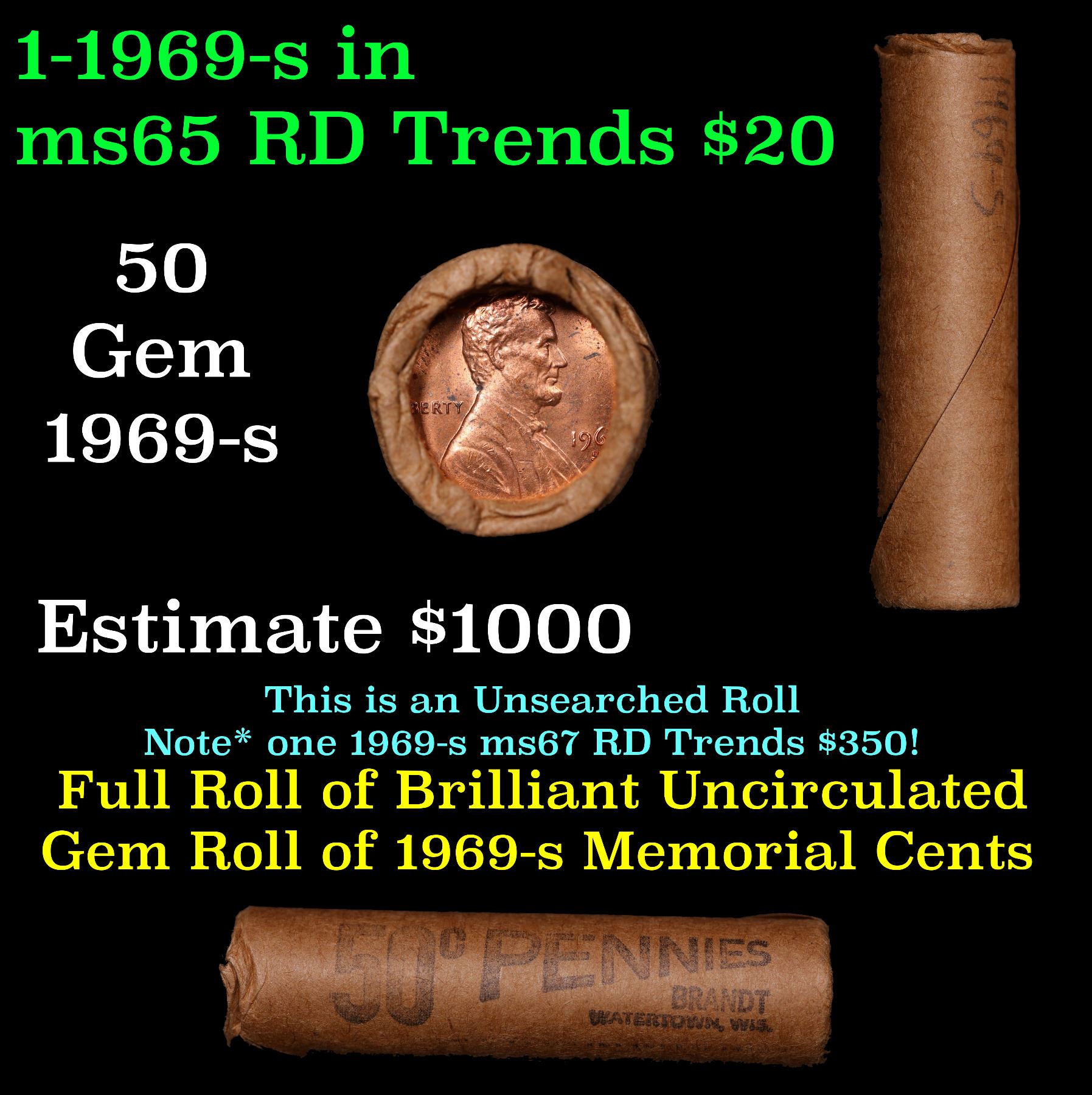 Shotgun Lincoln 1c roll, 1969-s 50 pcs Brandt 50c Wrapper.. A terrific Shotgun roll of Lincoln cents. Most if not all coin should be cherry red.