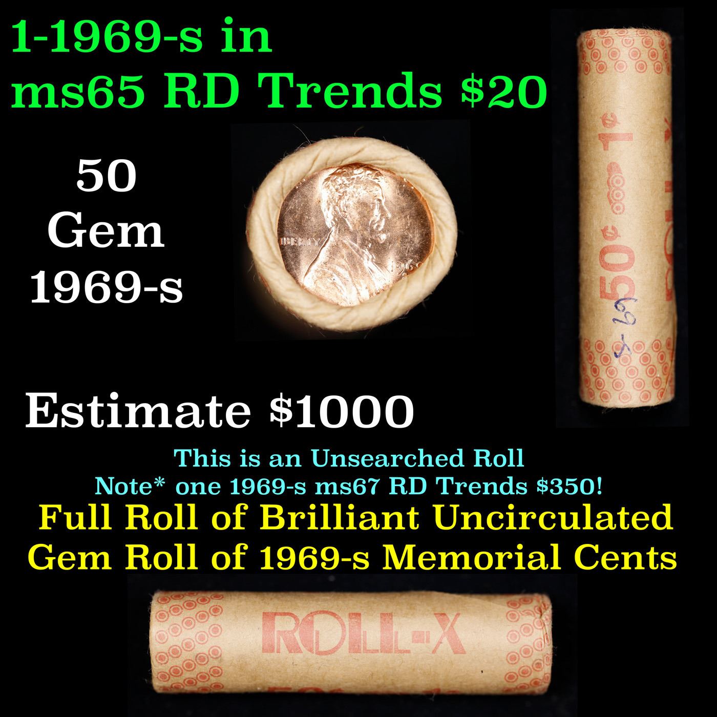 Shotgun Lincoln 1c roll, 1969-s 50 pcs Roll-x Wrapper.. A terrific roll of Lincoln cents. Most if not all coin should be cherry red. Trends ms65 rd $18