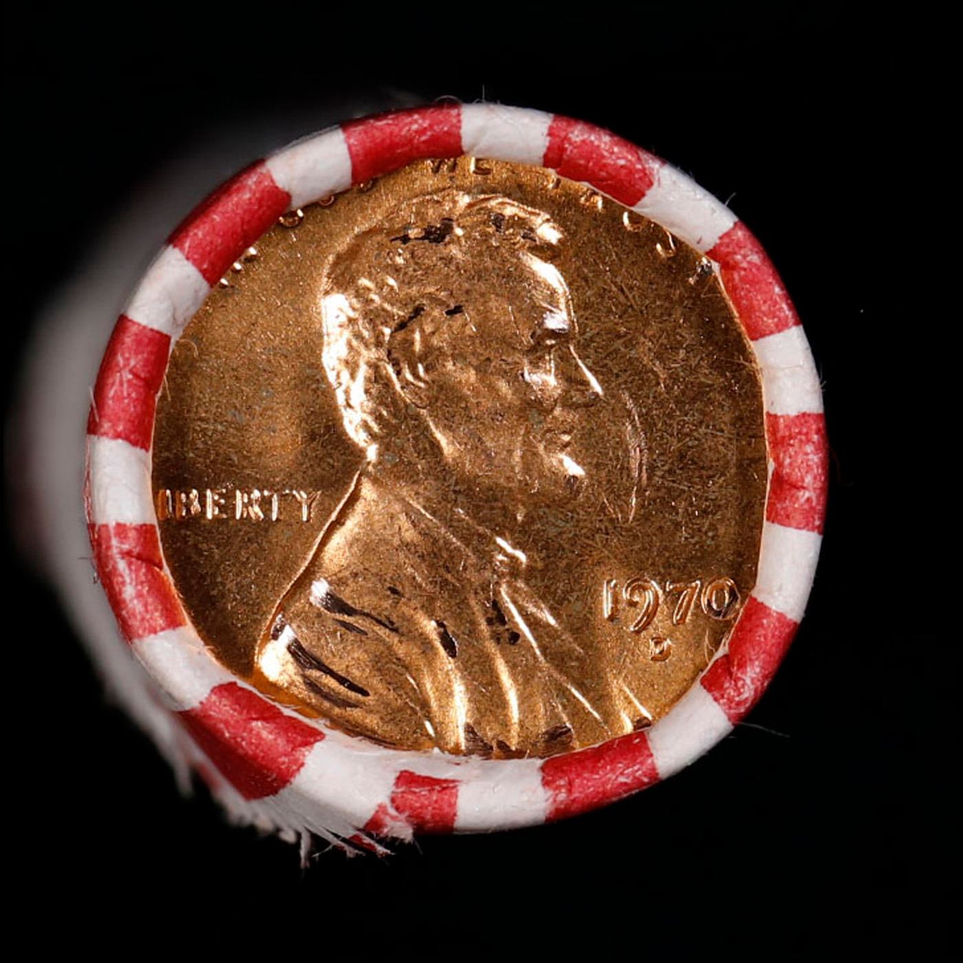 Shotgun Lincoln 1c roll, 1970-d 50 pcs Bank Wrapper.. A terrific Shotgun roll of Lincoln cents. Most if not all coin should be cherry red.