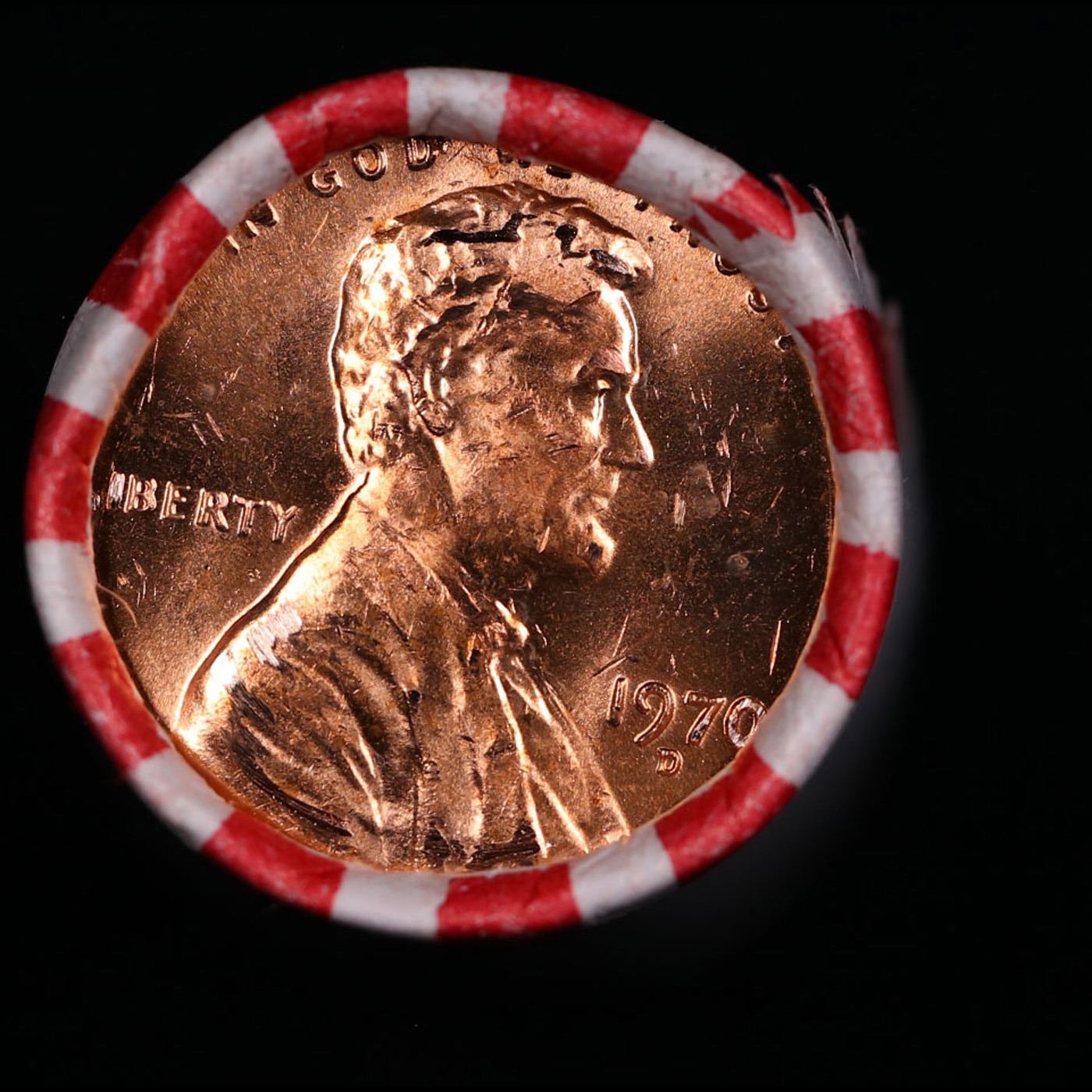 Shotgun Lincoln 1c roll, 1970-d 50 pcs Bank Wrapper.. A terrific Shotgun roll of Lincoln cents. Most if not all coin should be cherry red.