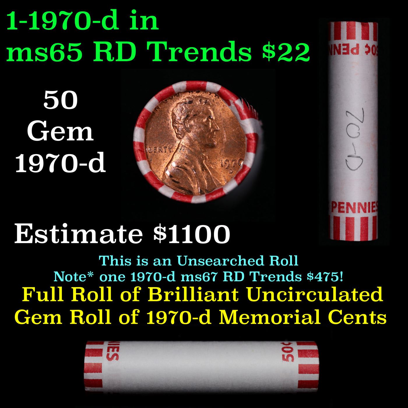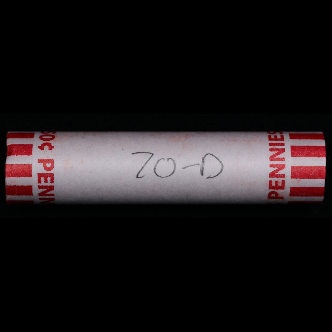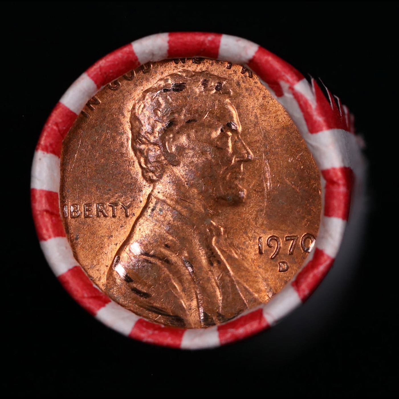 Shotgun Lincoln 1c roll, 1970-d 50 pcs Bank Wrapper.. A terrific Shotgun roll of Lincoln cents. Most if not all coin should be cherry red.