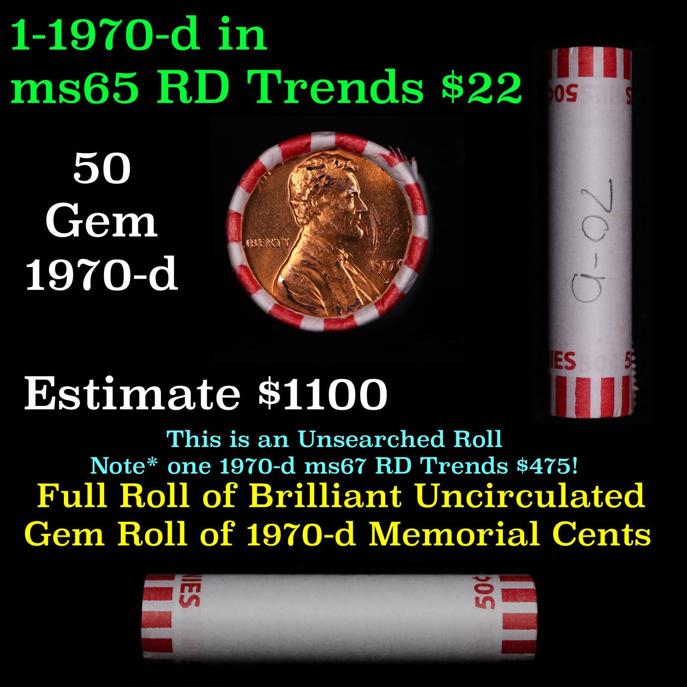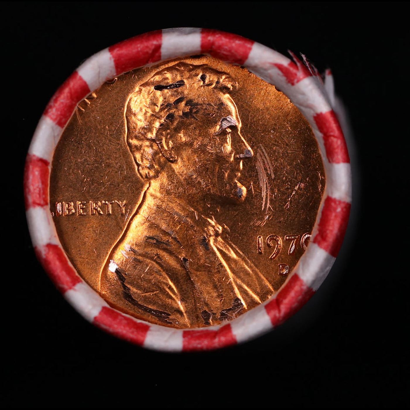 Shotgun Lincoln 1c roll, 1970-d 50 pcs Bank Wrapper.. A terrific Shotgun roll of Lincoln cents. Most if not all coin should be cherry red.