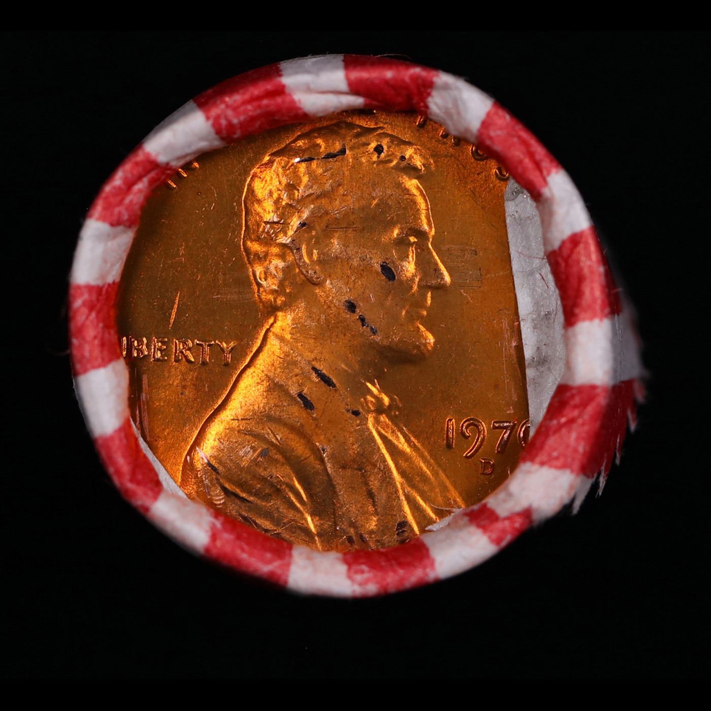 Shotgun Lincoln 1c roll, 1970-d 50 pcs Bank Wrapper.. A terrific Shotgun roll of Lincoln cents. Most if not all coin should be cherry red.