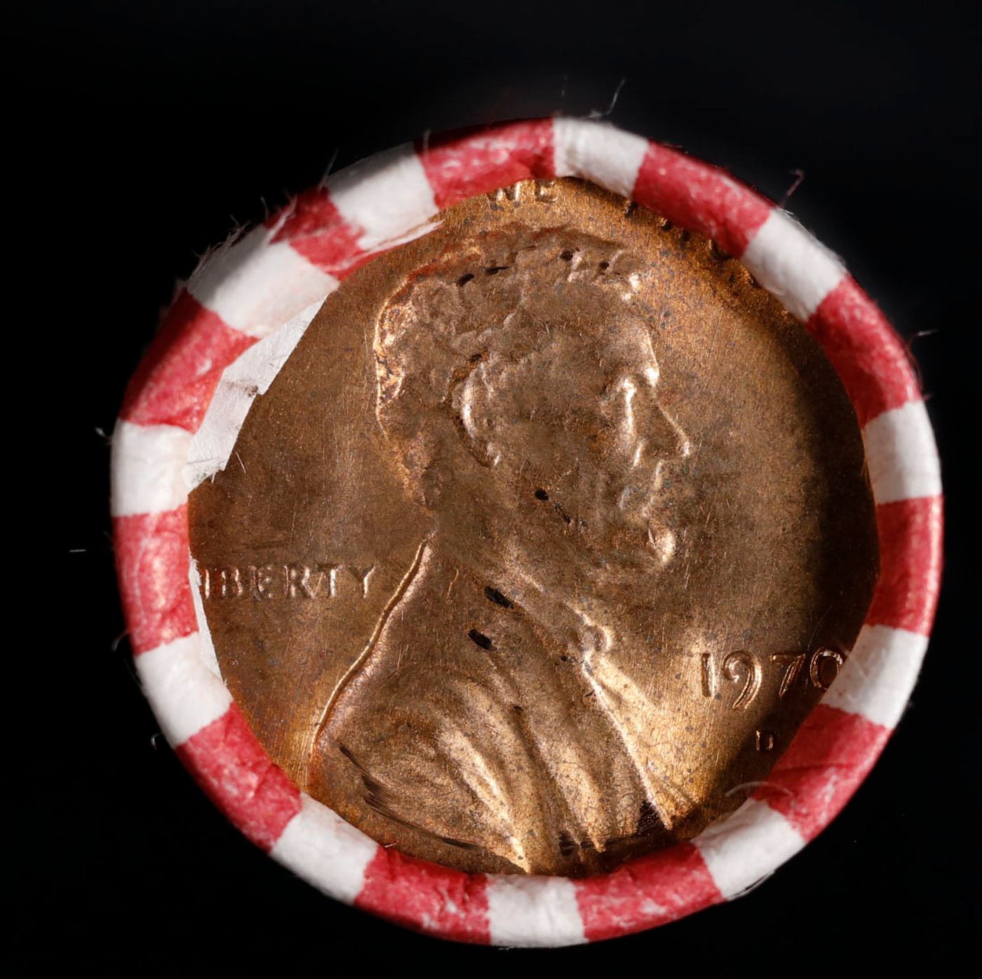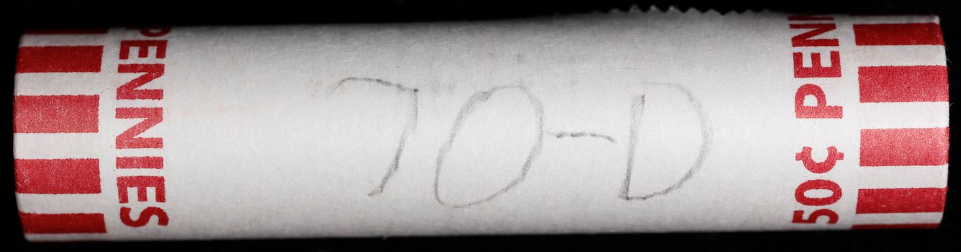 Shotgun Lincoln 1c roll, 1970-d 50 pcs Bank Wrapper.. A terrific Shotgun roll of Lincoln cents. Most if not all coin should be cherry red.