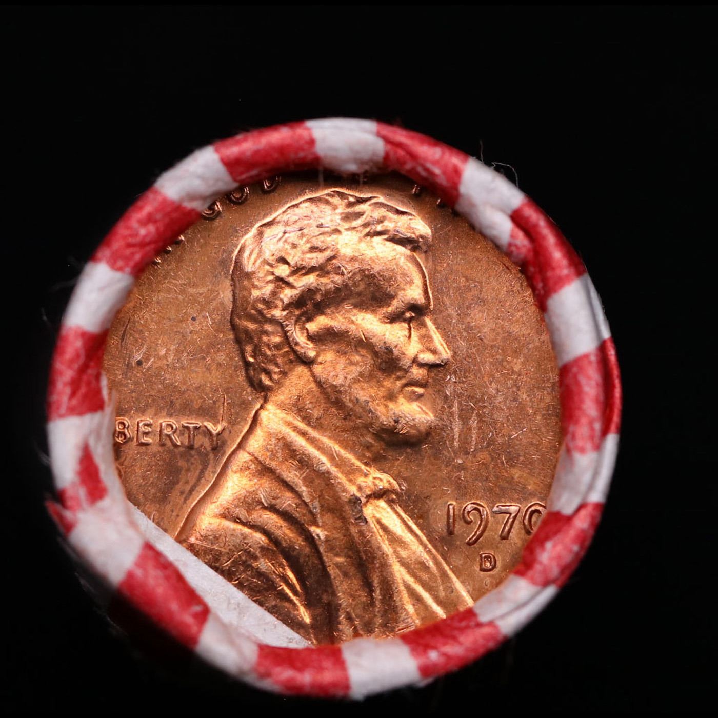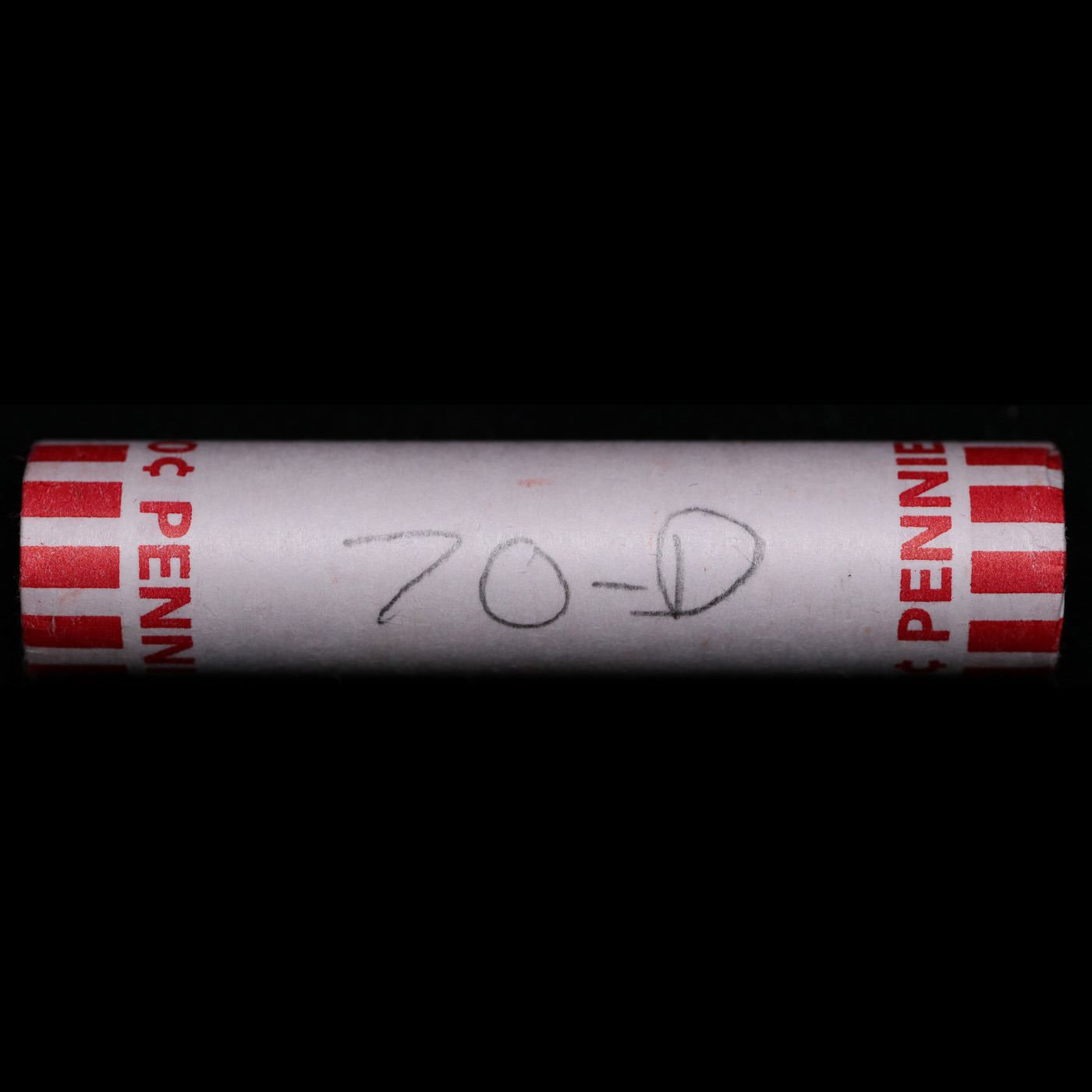 Shotgun Lincoln 1c roll, 1970-d 50 pcs Bank Wrapper.. A terrific Shotgun roll of Lincoln cents. Most if not all coin should be cherry red.