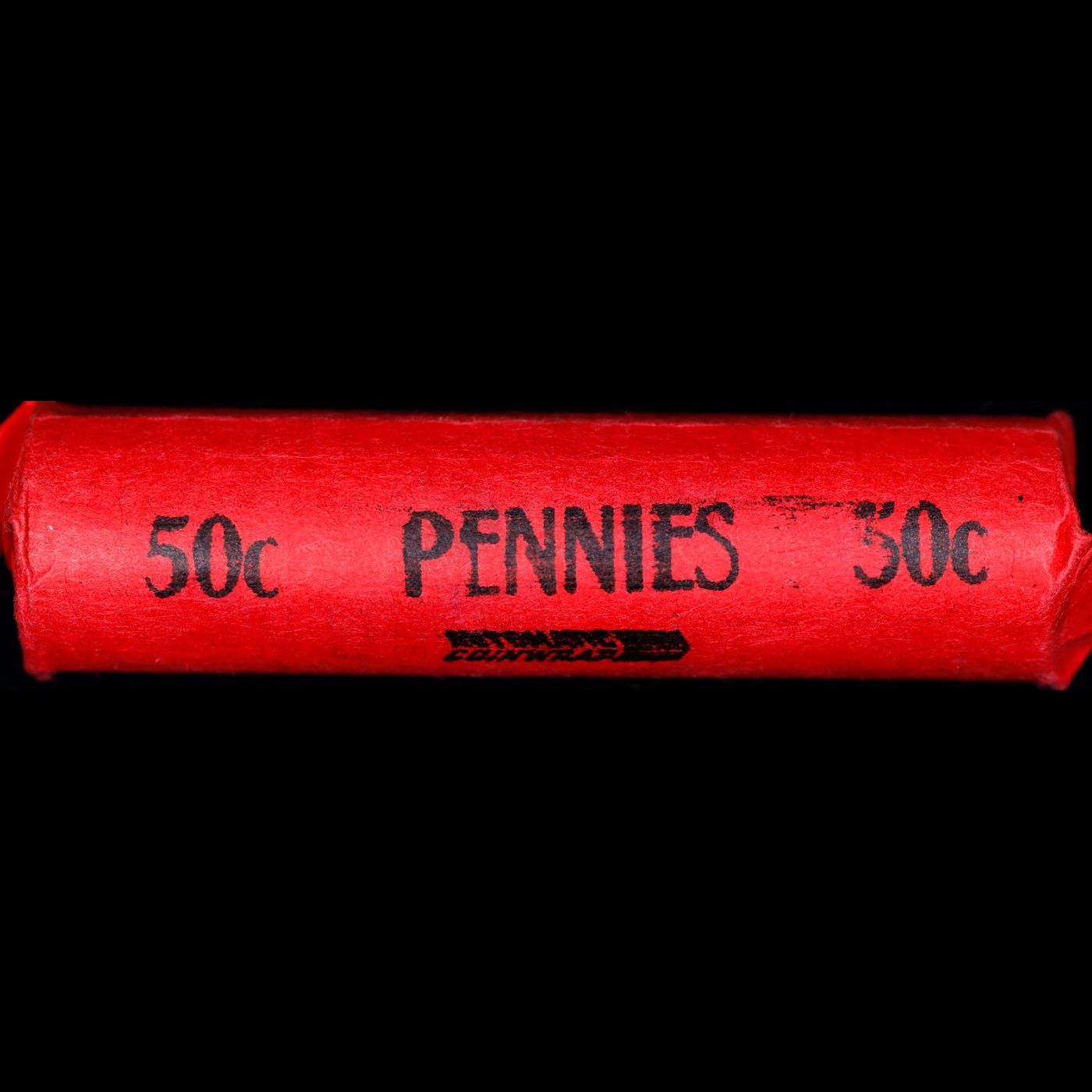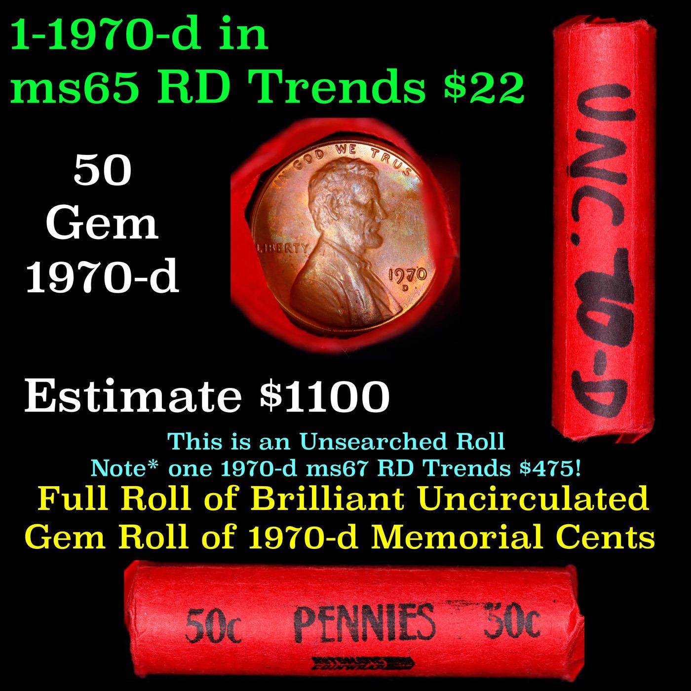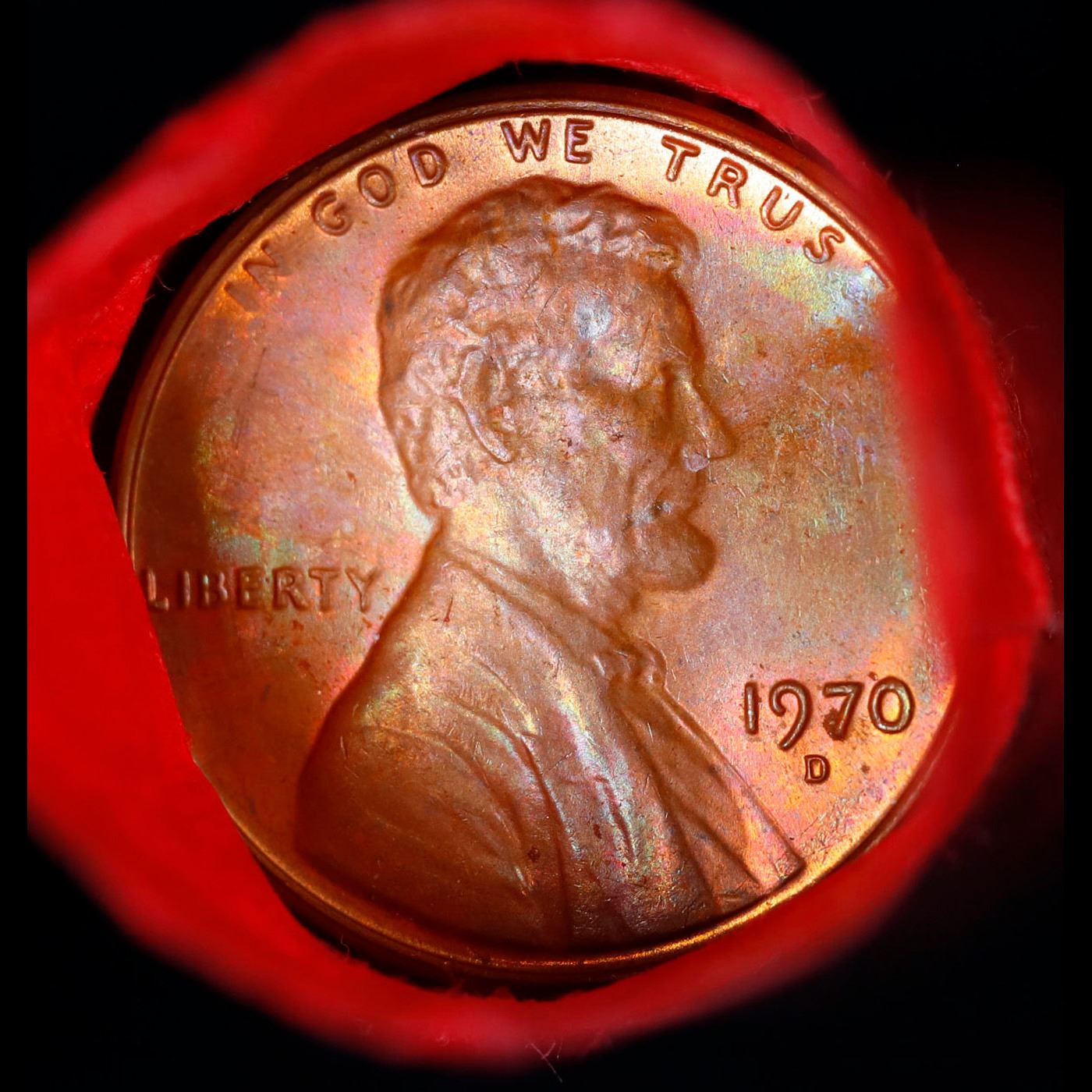 Shotgun Lincoln 1c roll, 1970-d 50 pcs Wrapper . A terrific Shotgun roll of Lincoln cents. All coins appear to be cherry red. Trends ms65 rd $18