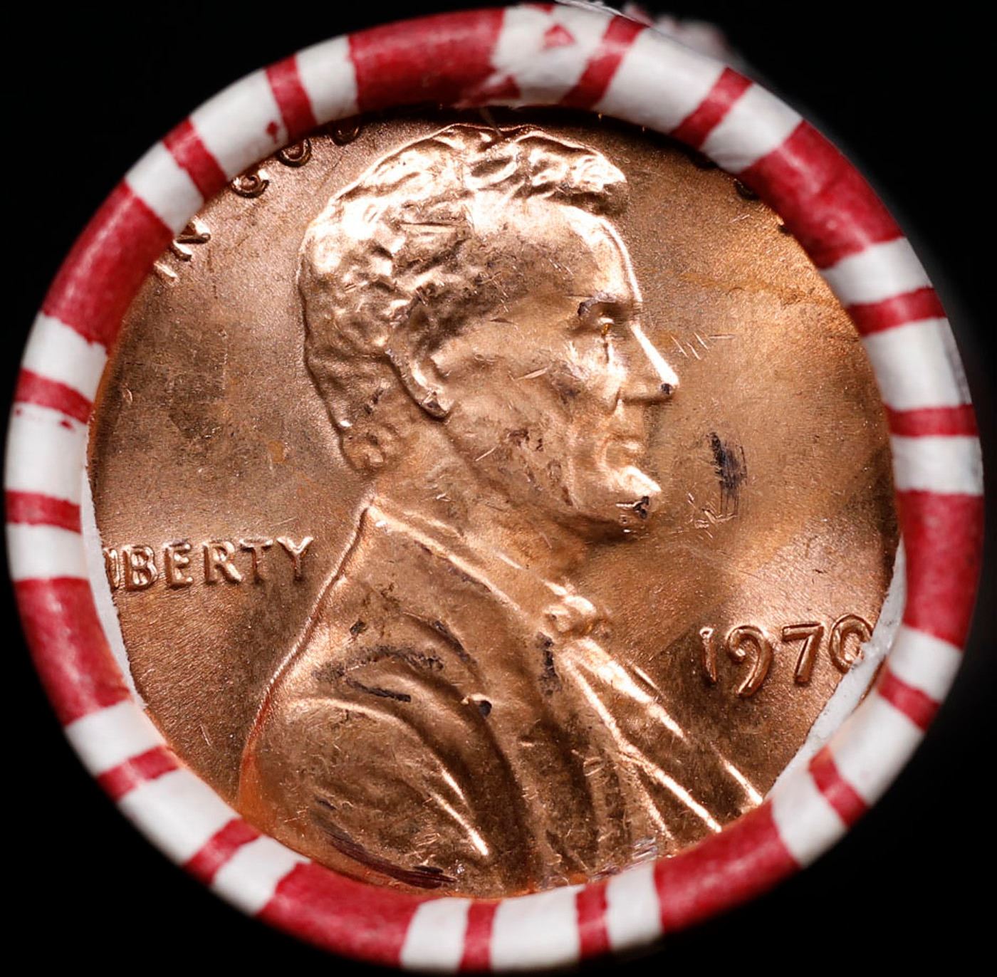 Shotgun Lincoln 1c roll, 1970-p 50 pcs Bank 50c Wrapper.. A terrific Shotgun roll of Lincoln cents. Most if not all coin should be cherry red.