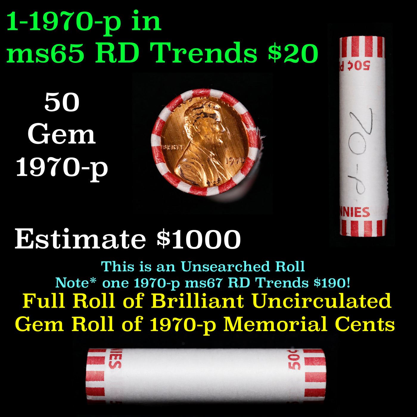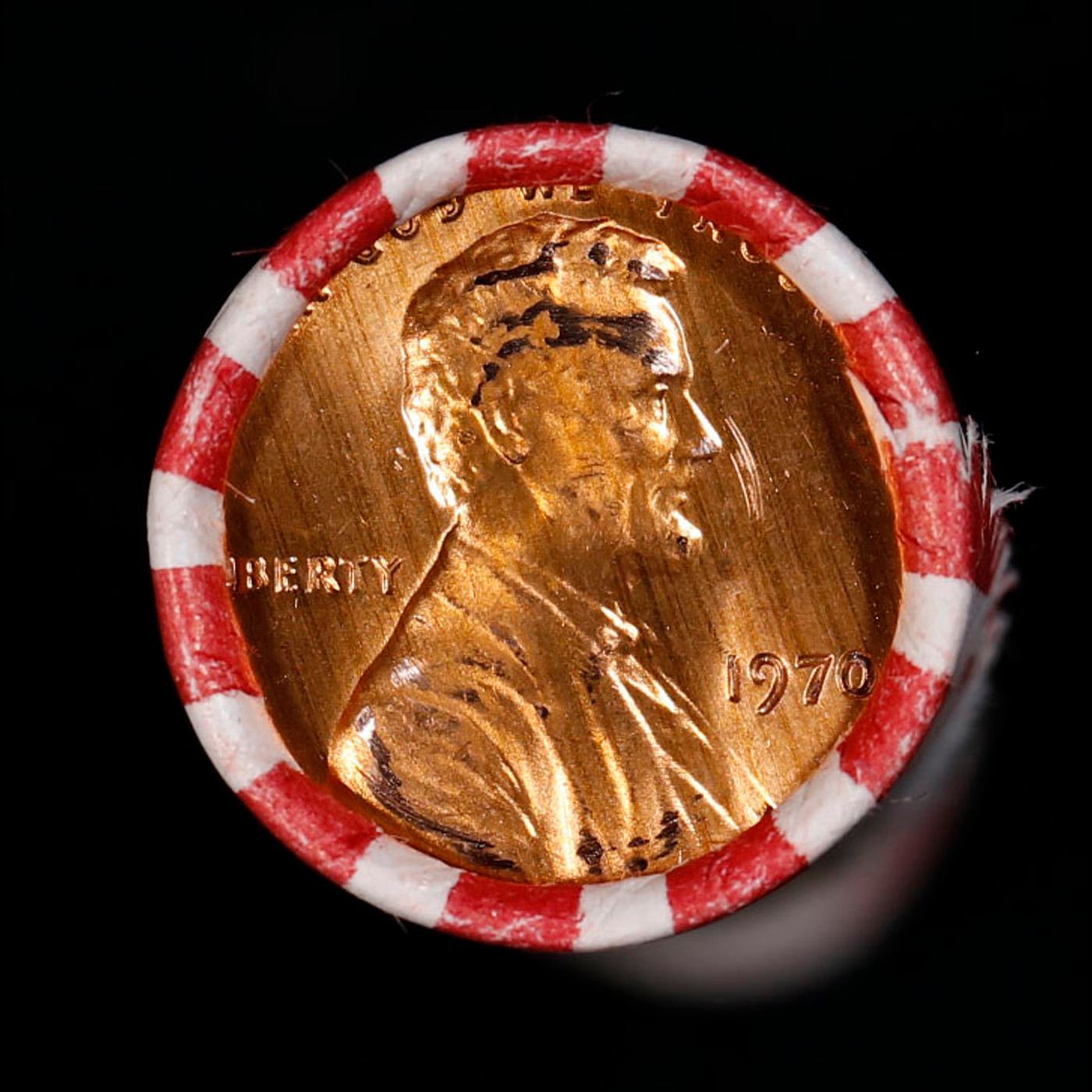 Shotgun Lincoln 1c roll, 1970-p 50 pcs Bank Wrapper.. A terrific Shotgun roll of Lincoln cents. Most if not all coin should be cherry red.