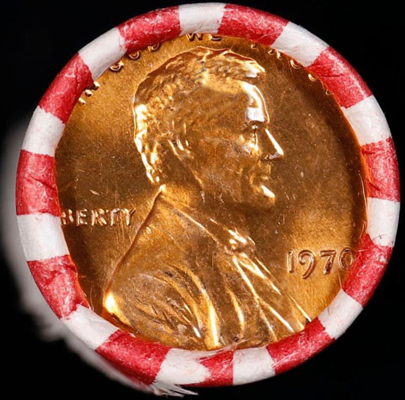 Shotgun Lincoln 1c roll, 1970-p 50 pcs Bank Wrapper.. A terrific Shotgun roll of Lincoln cents. Most if not all coin should be cherry red.