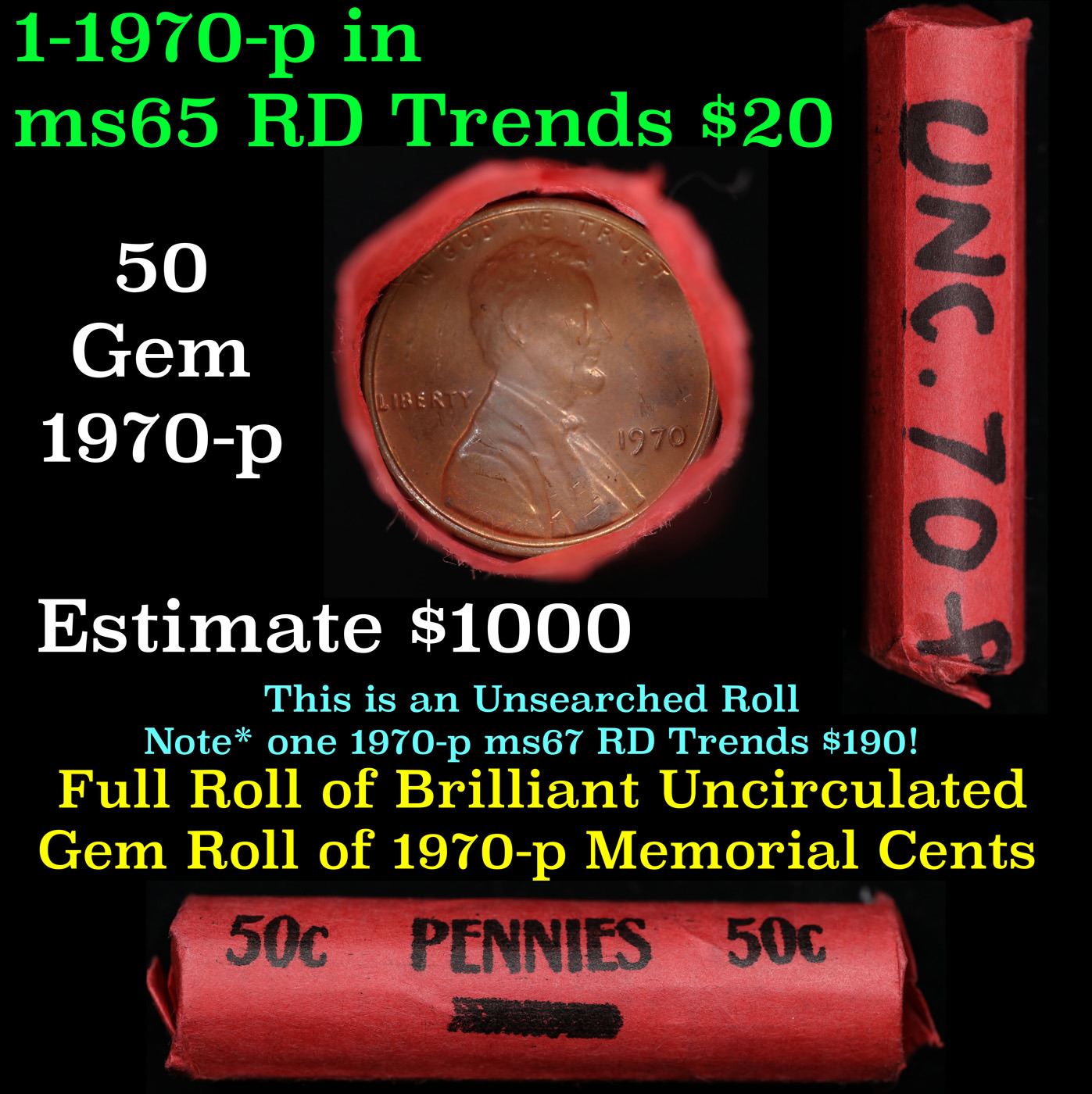 Shotgun Lincoln 1c roll, 1970-p 50 pcs Coinwrap Wrapper .