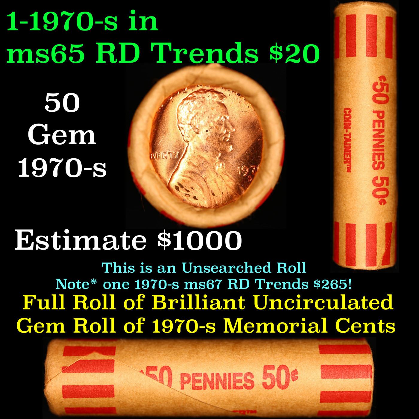 Shotgun Lincoln 1c roll, 1970-s 50, Coin-Tainer Wrapper. A terrific Shotgun roll of Lincoln cents. All coins cherry red. Trends ms65 rd $20