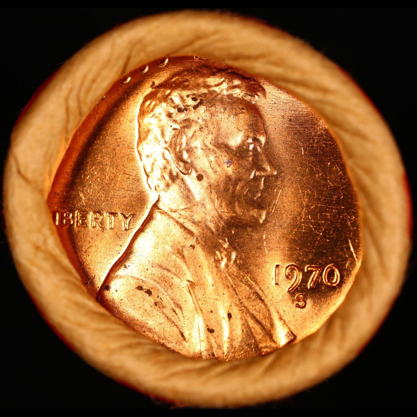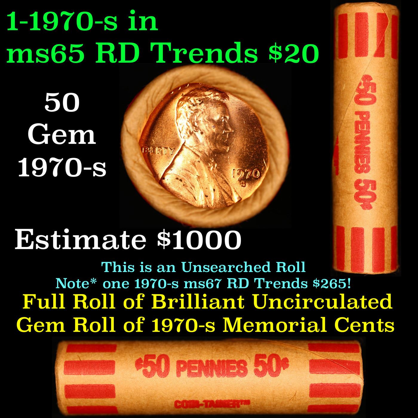 Shotgun Lincoln 1c roll, 1970-s 50, Coin-Tainer Wrapper. A terrific Shotgun roll of Lincoln cents. All coins cherry red. Trends ms65 rd $20