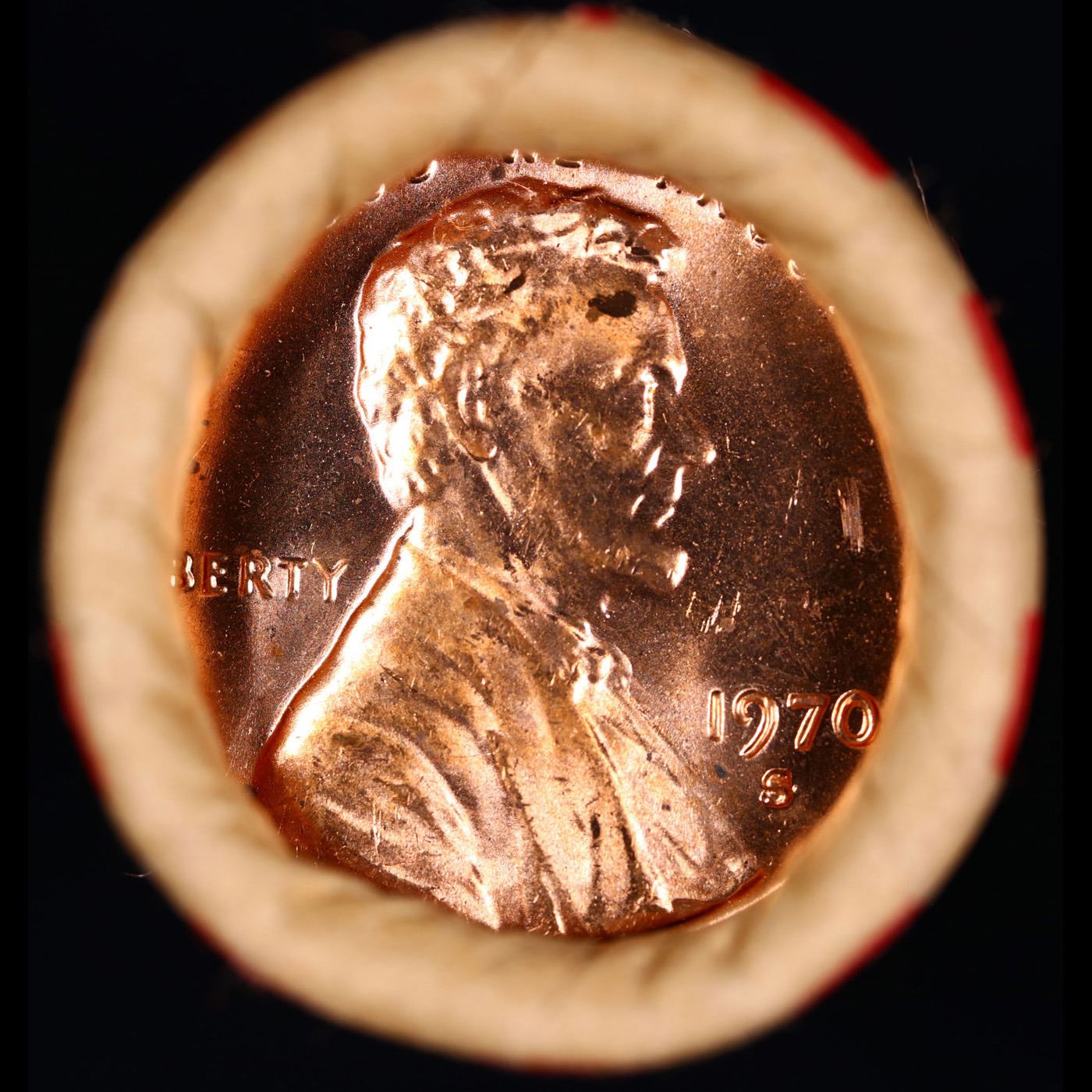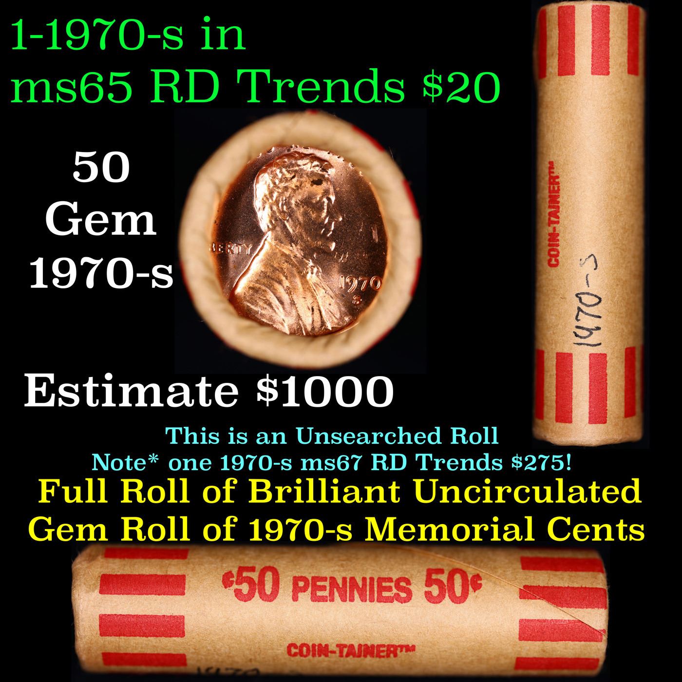 Shotgun Lincoln 1c roll, 1970-s 50 pcs Coin-Tainer Wrapper . A terrific Shotgun roll of Lincoln cents. All coins cherry red. Trends ms65 rd $20
