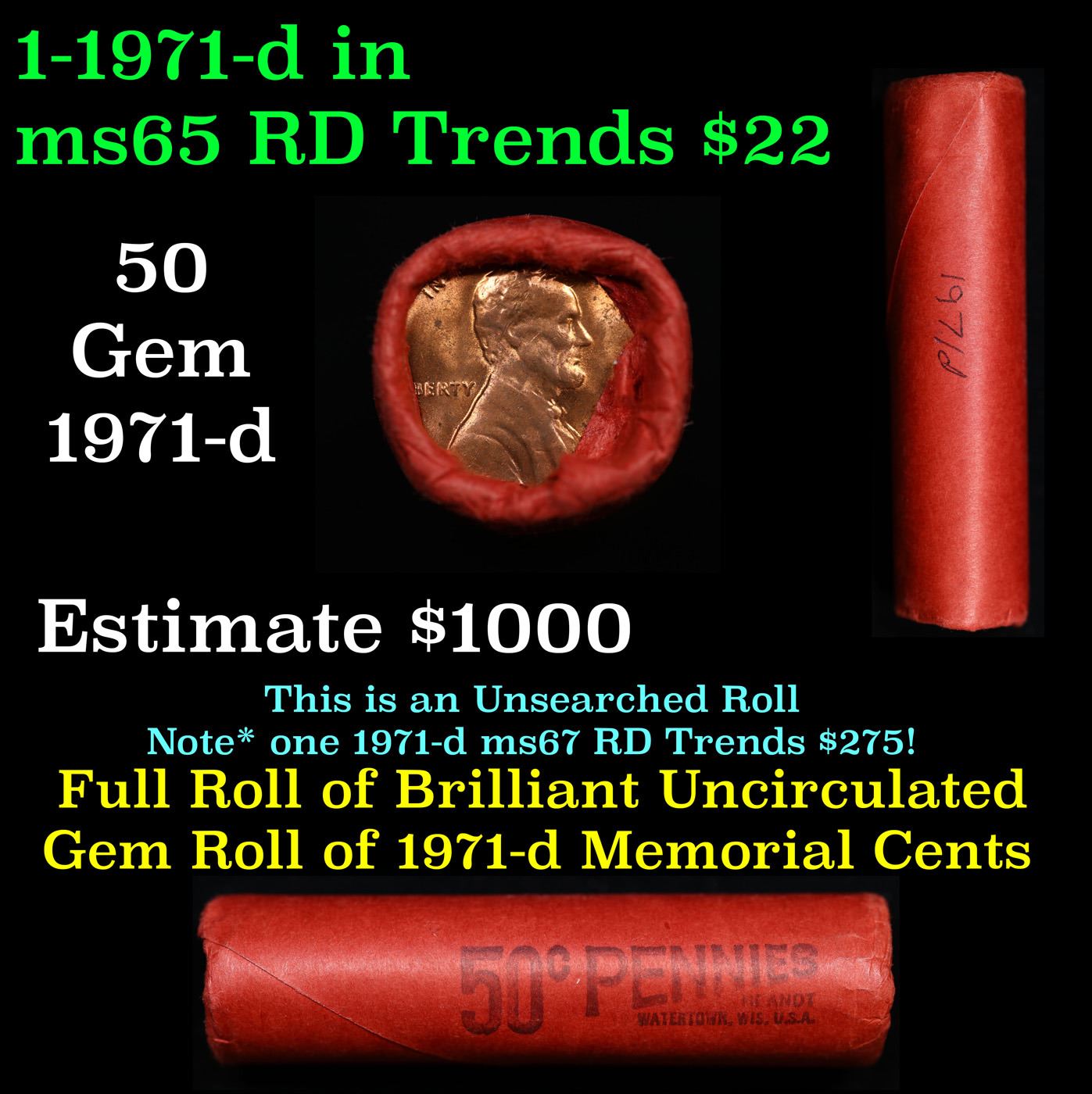 Shotgun Lincoln 1c roll, 1971-d 50 pcs Brandt Wrapper.. A terrific Shotgun roll of Lincoln cents. Most if not all coin should be cherry red.