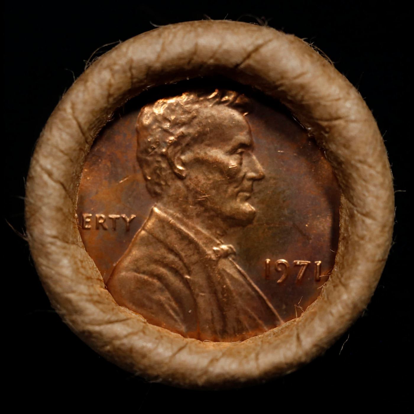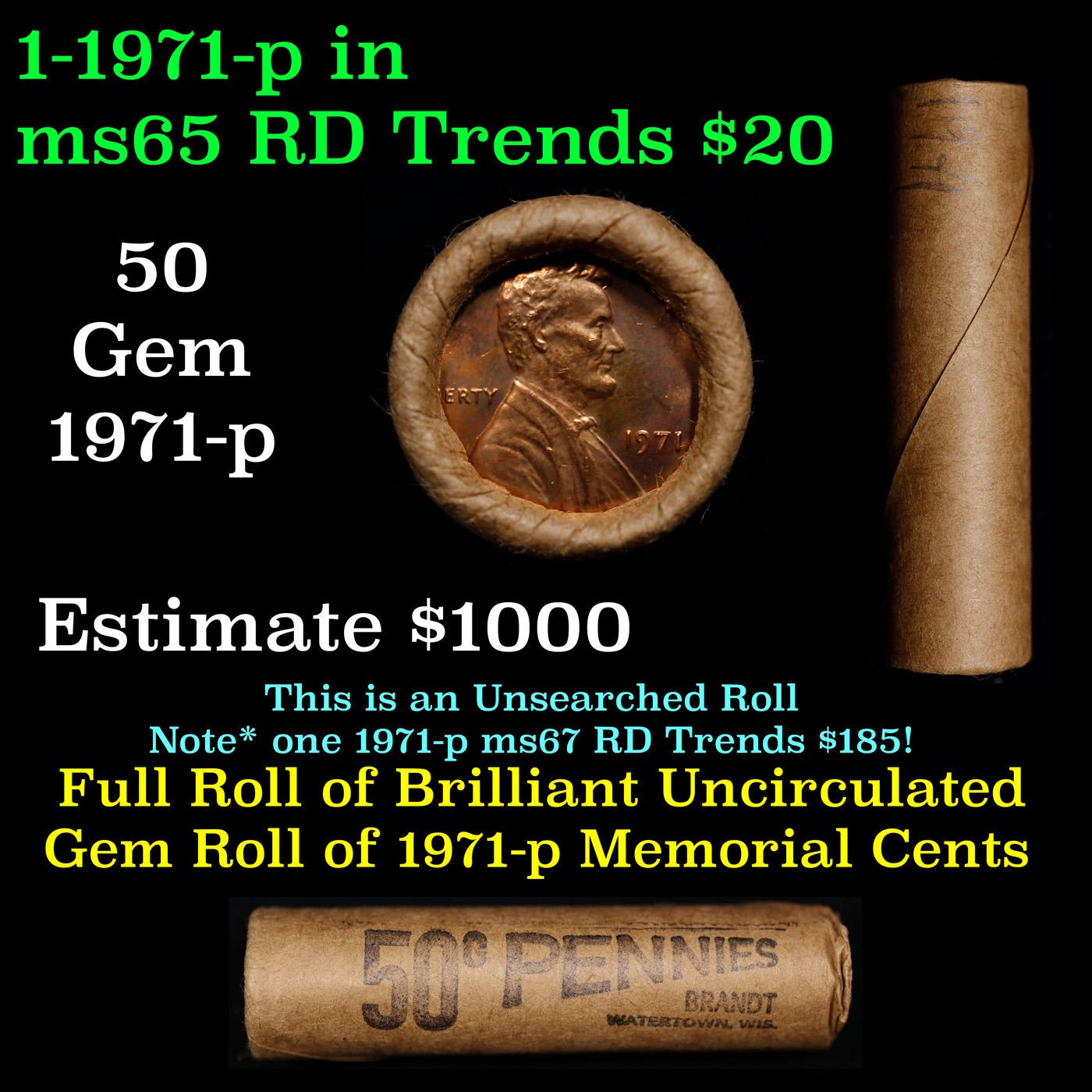 Shotgun Lincoln 1c roll, 1971-p 50 pcs Brandt Wrapper.. A terrific Shotgun roll of Lincoln cents. Most if not all coin should be cherry red. Trends ms65 rd $20