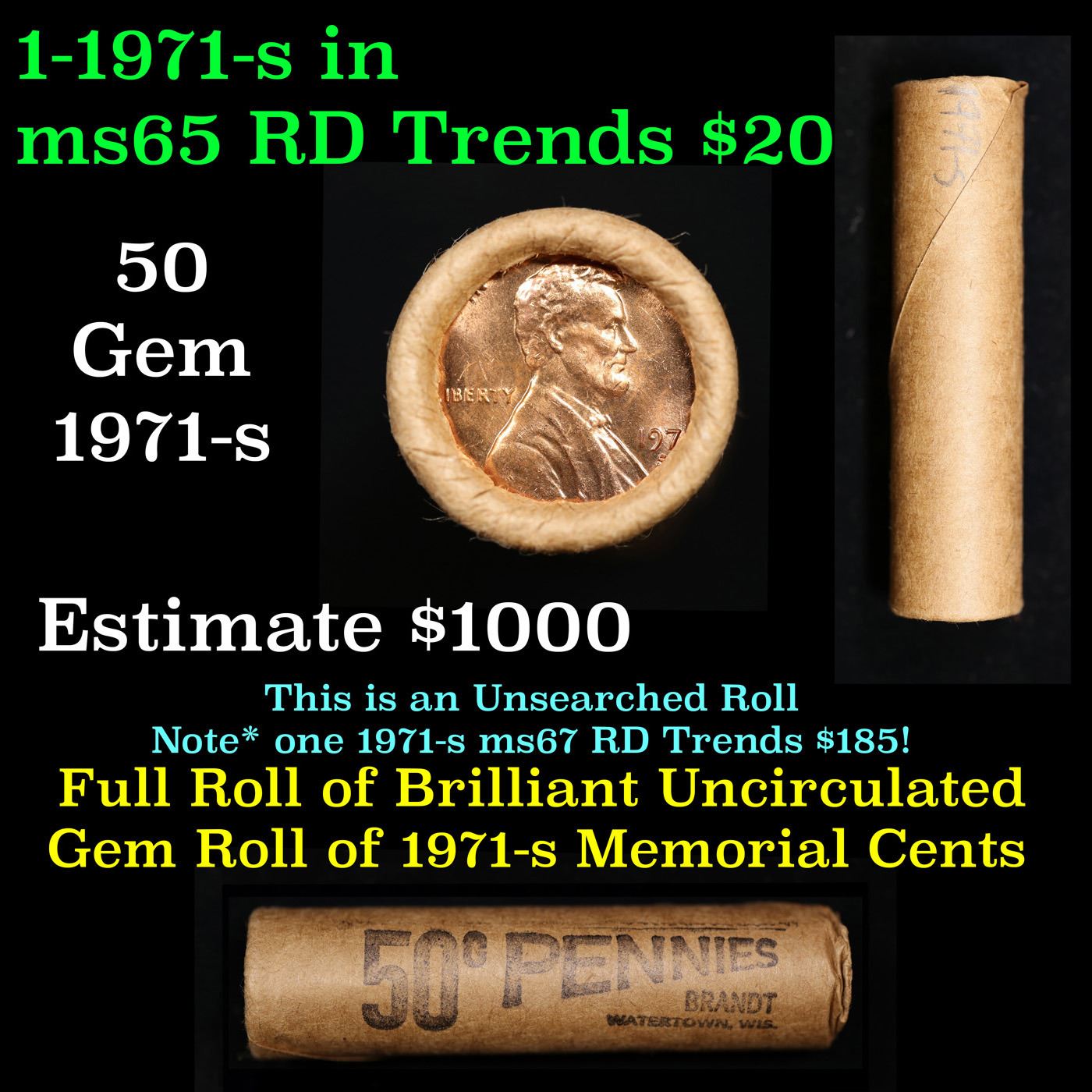 Shotgun Lincoln 1c roll, 1971-s 50 pcs Brandt Wrapper.. A terrific Shotgun roll of Lincoln cents. Most if not all coin should be cherry red. Trends ms65 rd $18