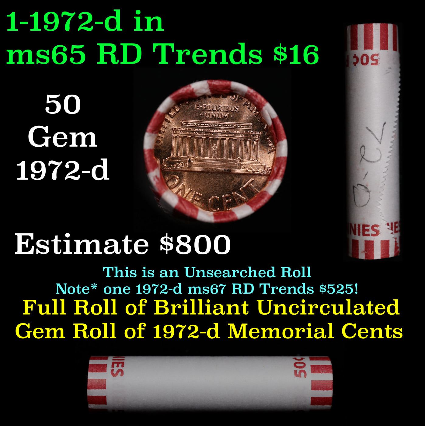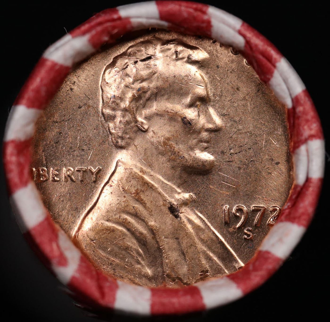 Shotgun Lincoln 1c roll, 1972-d 50 pcs Bank Wrapper.. A terrific Shotgun roll of Lincoln cents. Most if not all coin should be cherry red.