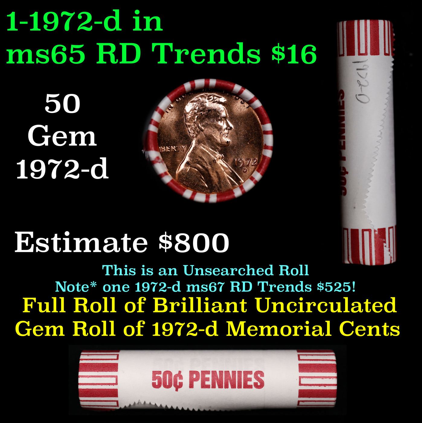 Shotgun Lincoln 1c roll, 1972-d 50 pcs Steel-Strong Wrapper.. A terrific Shotgun roll of Lincoln cents. Most if not all coin should be cherry red.