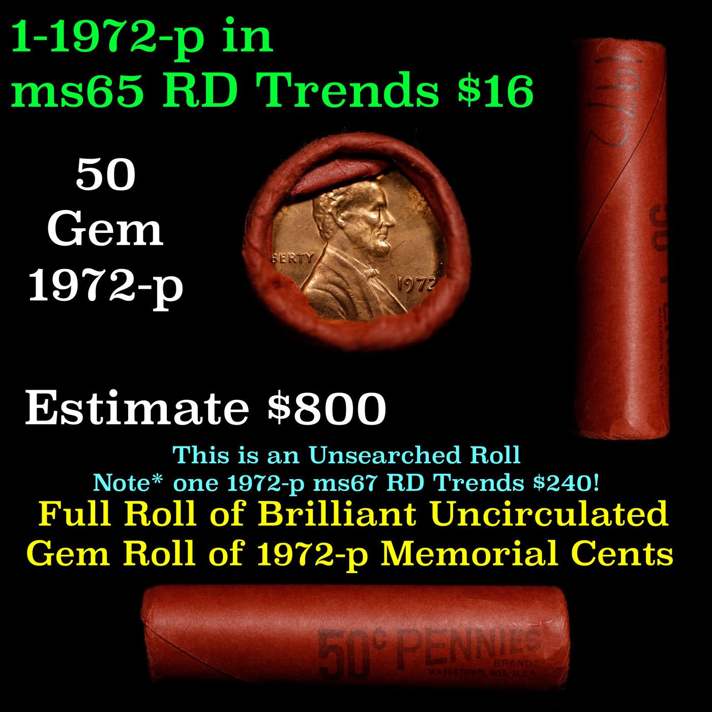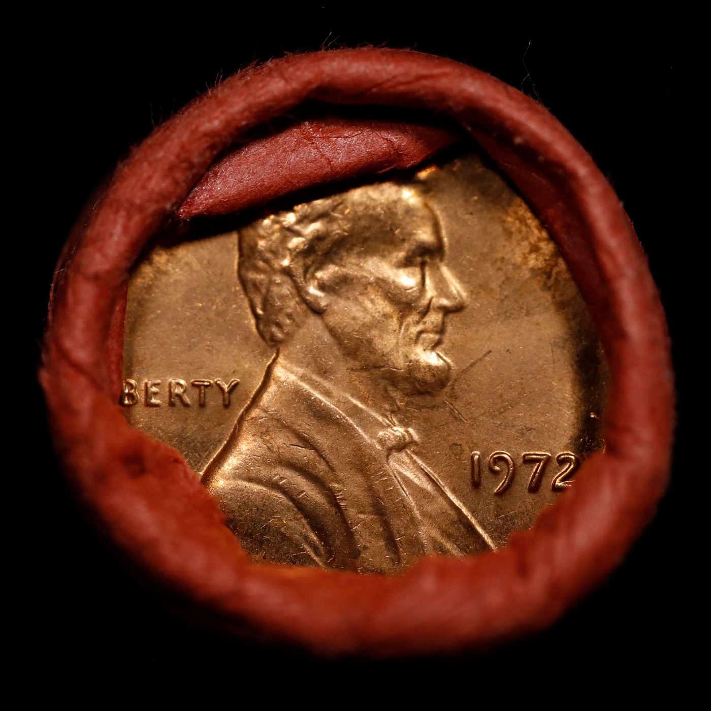 Shotgun Lincoln 1c roll, 1972-p 50 pcs Brandt Wrapper.. A terrific Shotgun roll of Lincoln cents. Most if not all coin should be cherry red. Trends ms65 rd $18