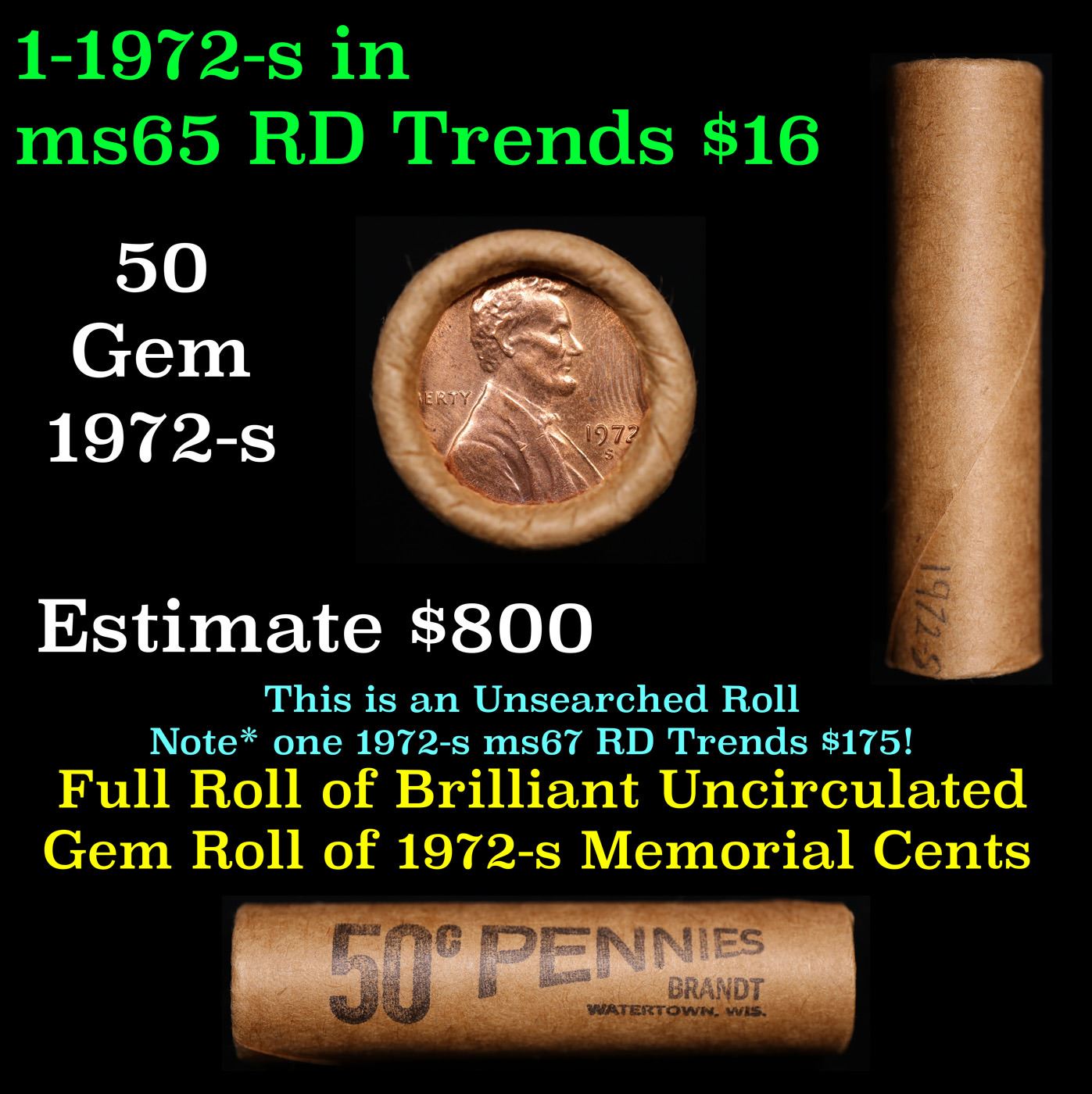 Shotgun Lincoln 1c roll, 1972-s 50 pcs Brandt Wrapper . A terrific Shotgun roll of Lincoln cents. All coins appear to be cherry red. Trends ms65 rd $16