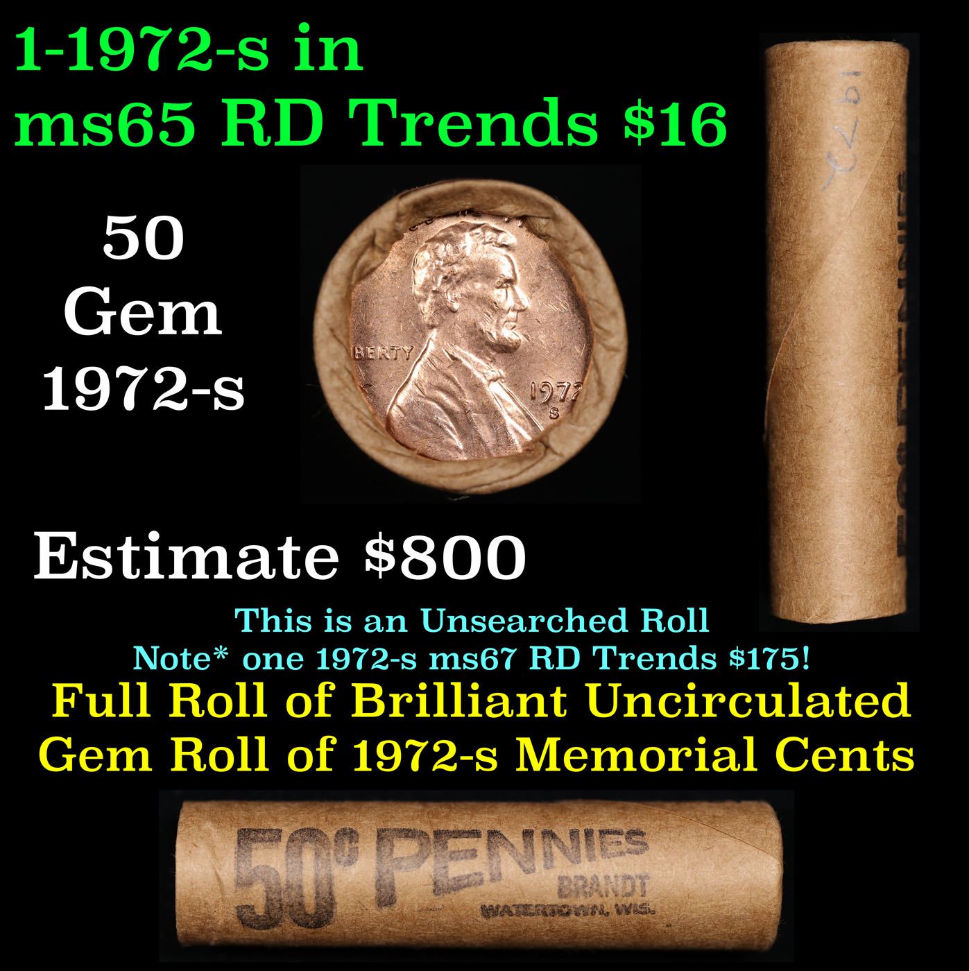 Shotgun Lincoln 1c roll, 1972-s 50 pcs Brandt Wrapper.. A terrific Shotgun roll of Lincoln cents. All coins appear to be cherry red. Trends ms65 rd $16