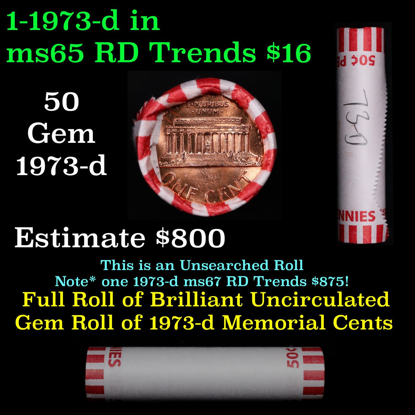 Shotgun Lincoln 1c roll, 1973-d 50 pcs Bank Wrapper.. A terrific Shotgun roll of Lincoln cents. Most if not all coin should be cherry red.
