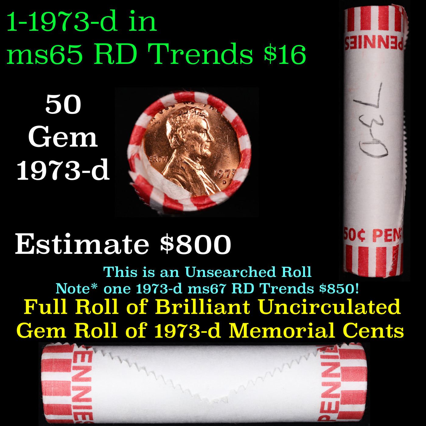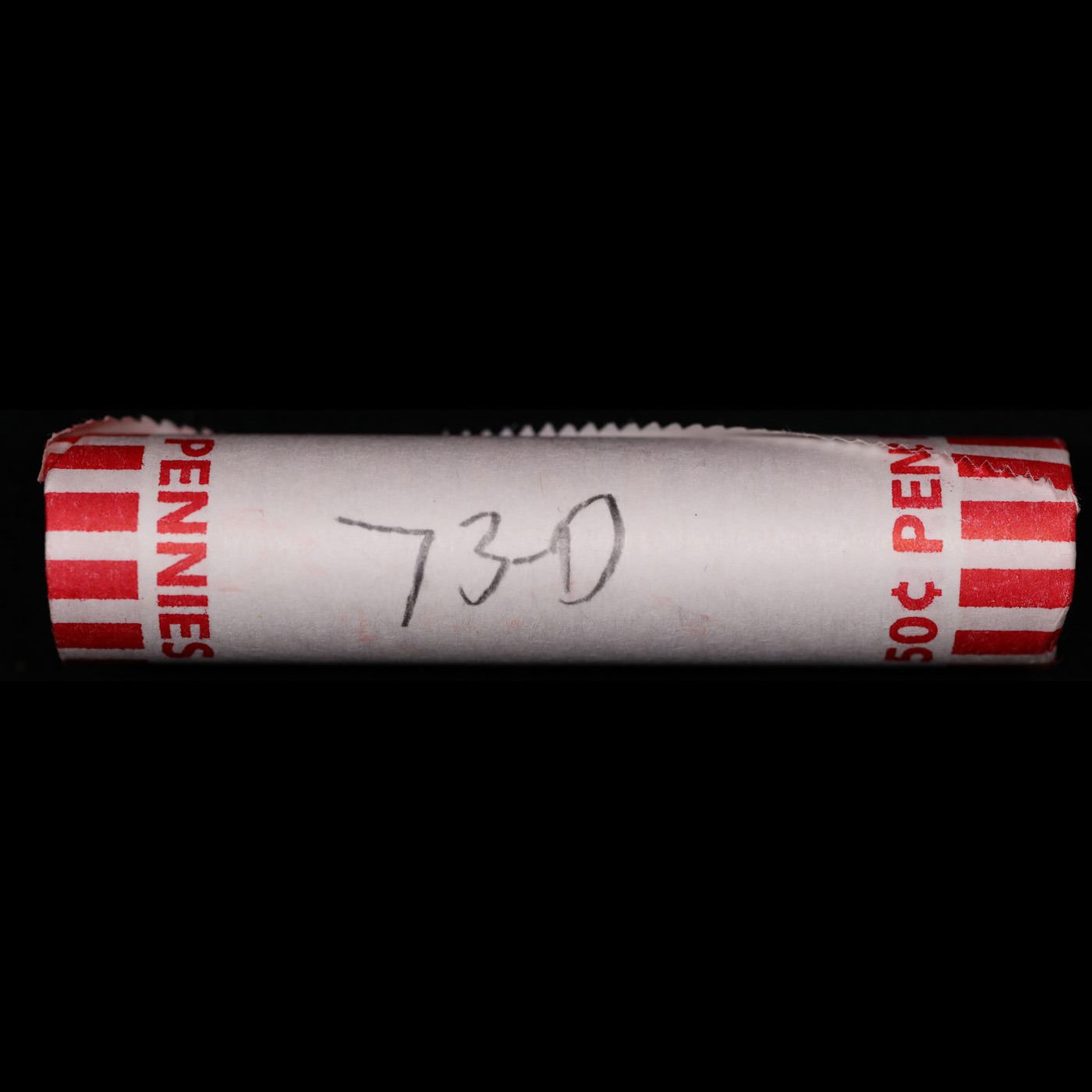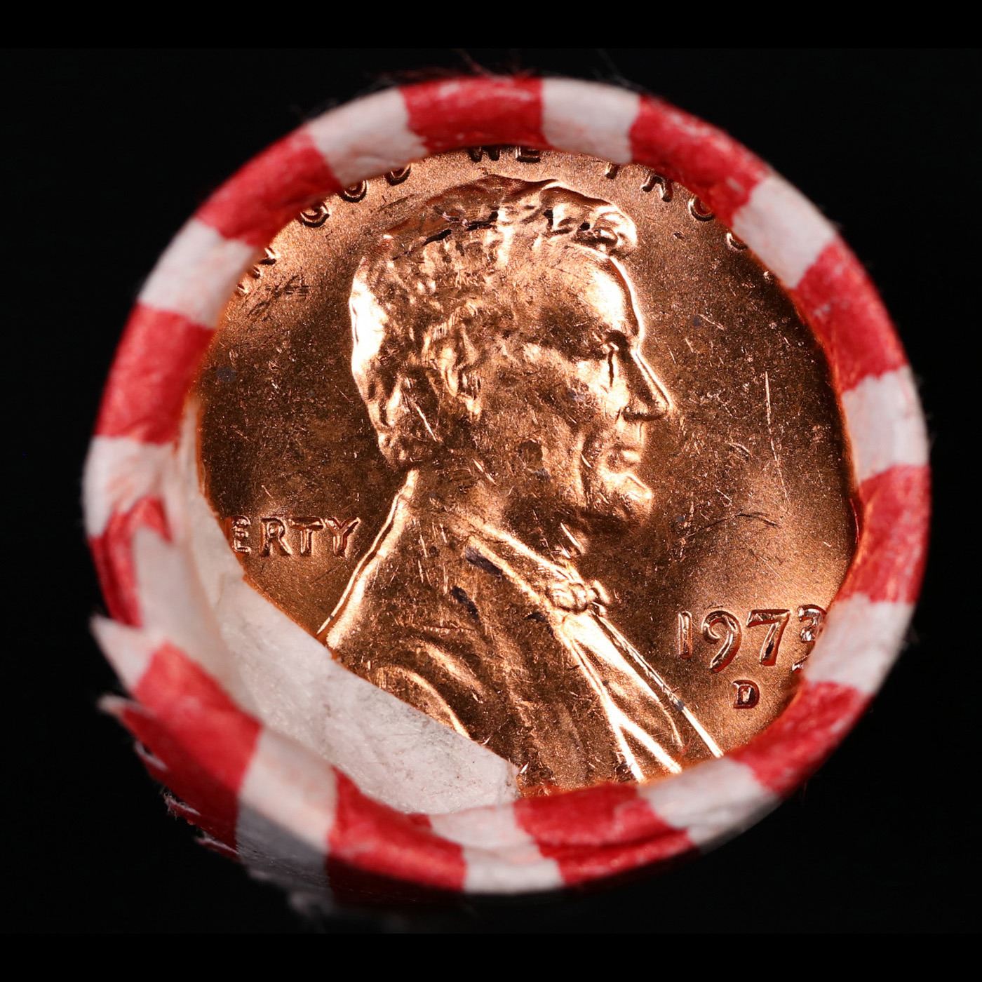 Shotgun Lincoln 1c roll, 1973-d 50 pcs Bank Wrapper.. A terrific Shotgun roll of Lincoln cents. Most if not all coin should be cherry red.