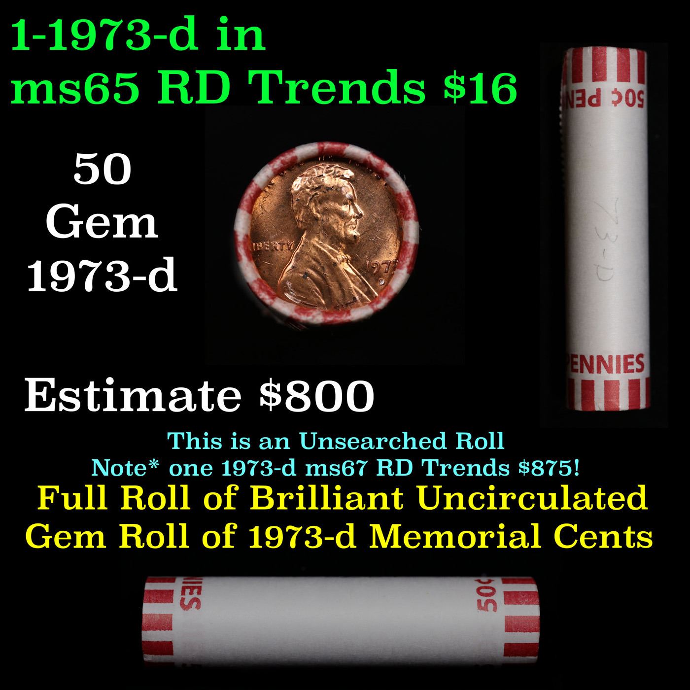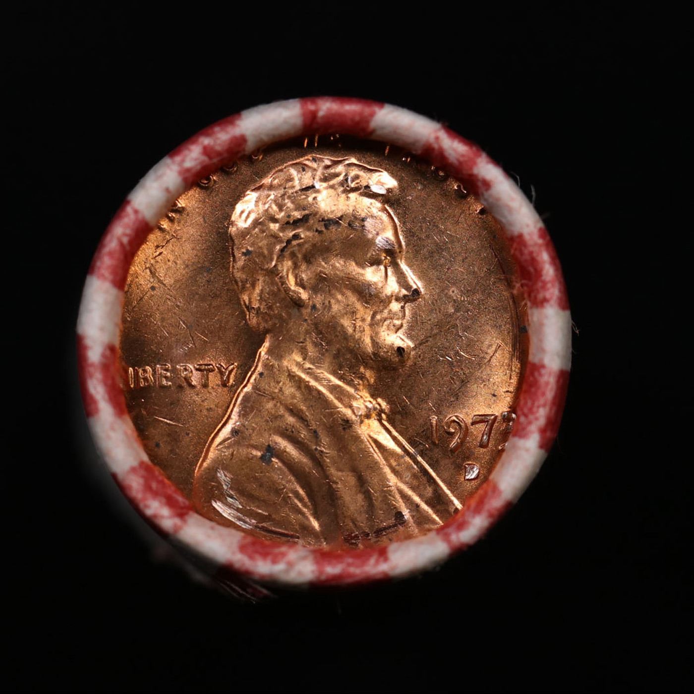 Shotgun Lincoln 1c roll, 1973-d 50 pcs Bank Wrapper.. A terrific Shotgun roll of Lincoln cents. Most if not all coin should be cherry red.