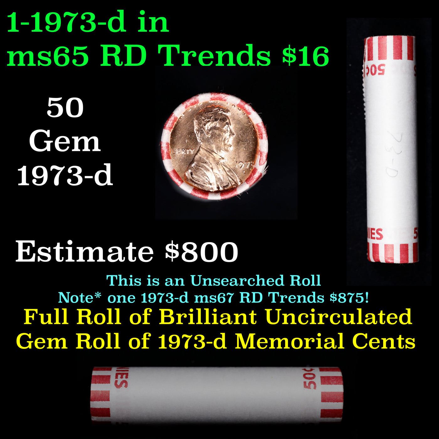 Shotgun Lincoln 1c roll, 1973-d 50 pcs Bank Wrapper.. A terrific Shotgun roll of Lincoln cents. Most if not all coin should be cherry red.
