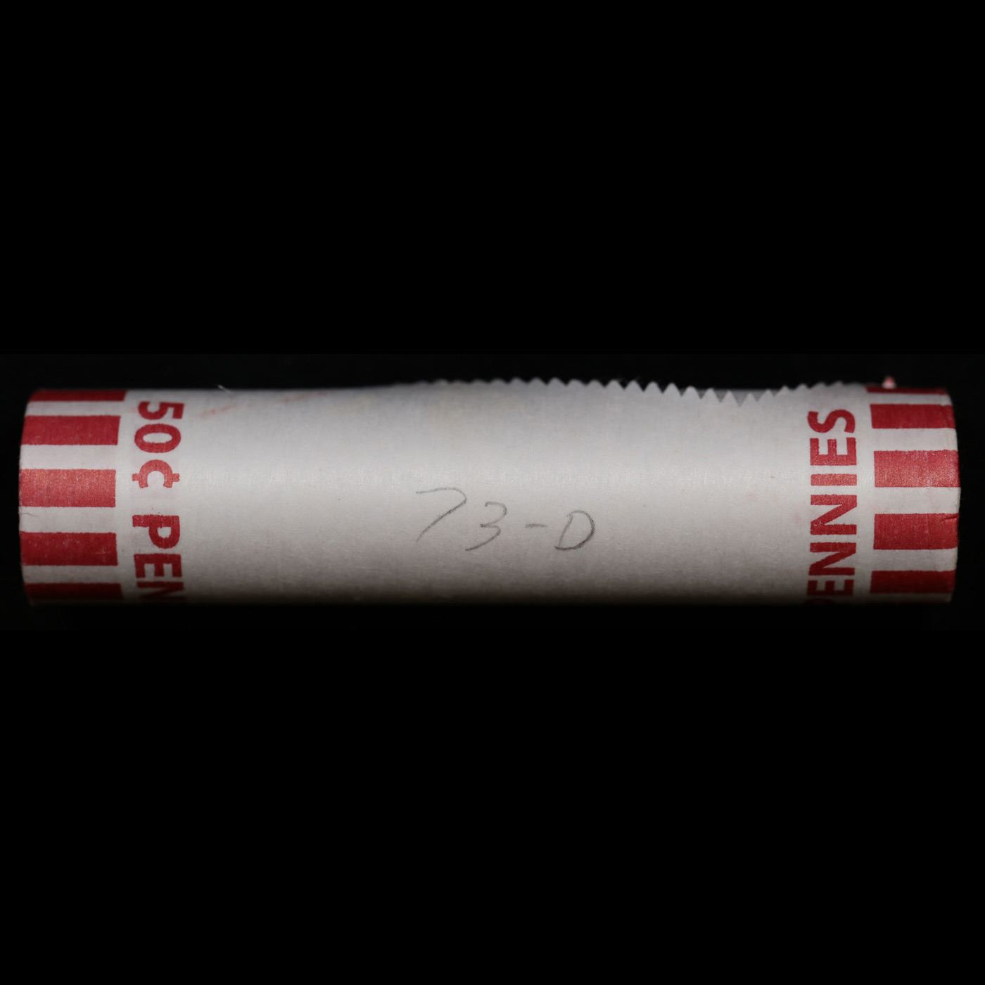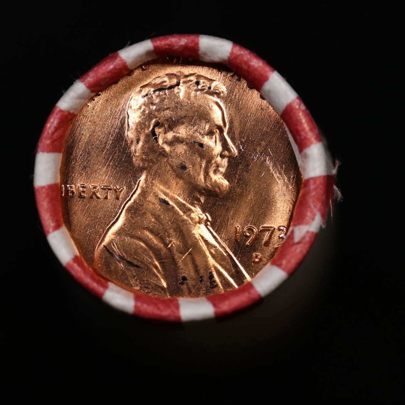 Shotgun Lincoln 1c roll, 1973-d 50 pcs Bank Wrapper.. A terrific Shotgun roll of Lincoln cents. Most if not all coin should be cherry red.