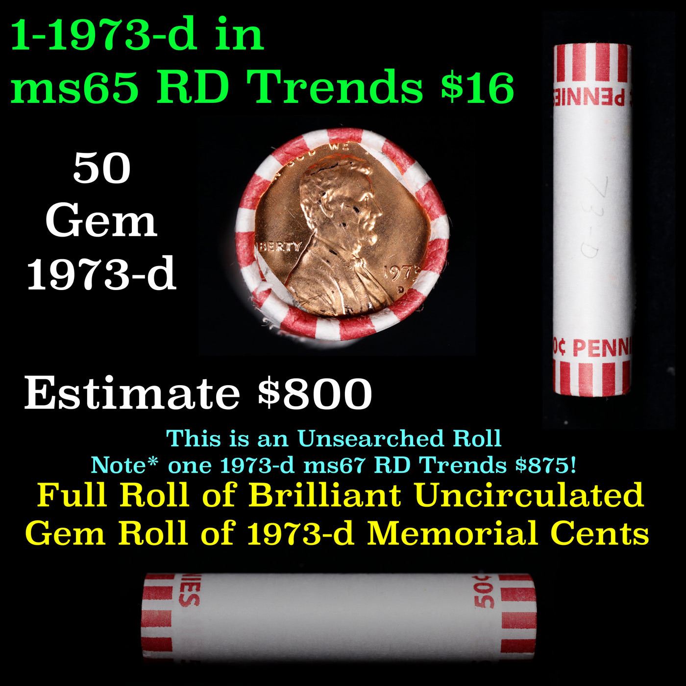 Shotgun Lincoln 1c roll, 1973-d 50 pcs Bank Wrapper.. A terrific Shotgun roll of Lincoln cents. Most if not all coin should be cherry red.