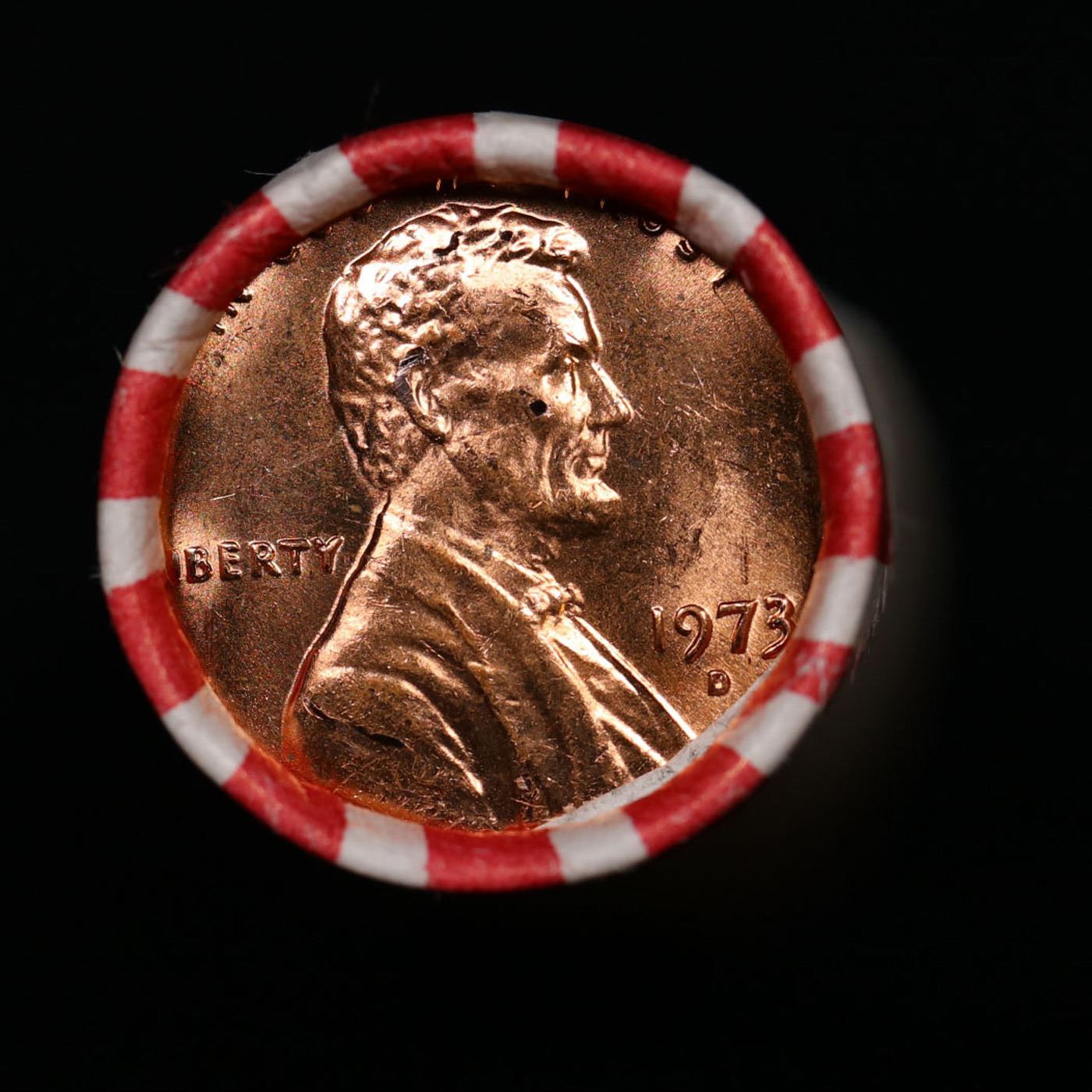 Shotgun Lincoln 1c roll, 1973-d 50 pcs Bank Wrapper.. A terrific Shotgun roll of Lincoln cents. Most if not all coin should be cherry red.