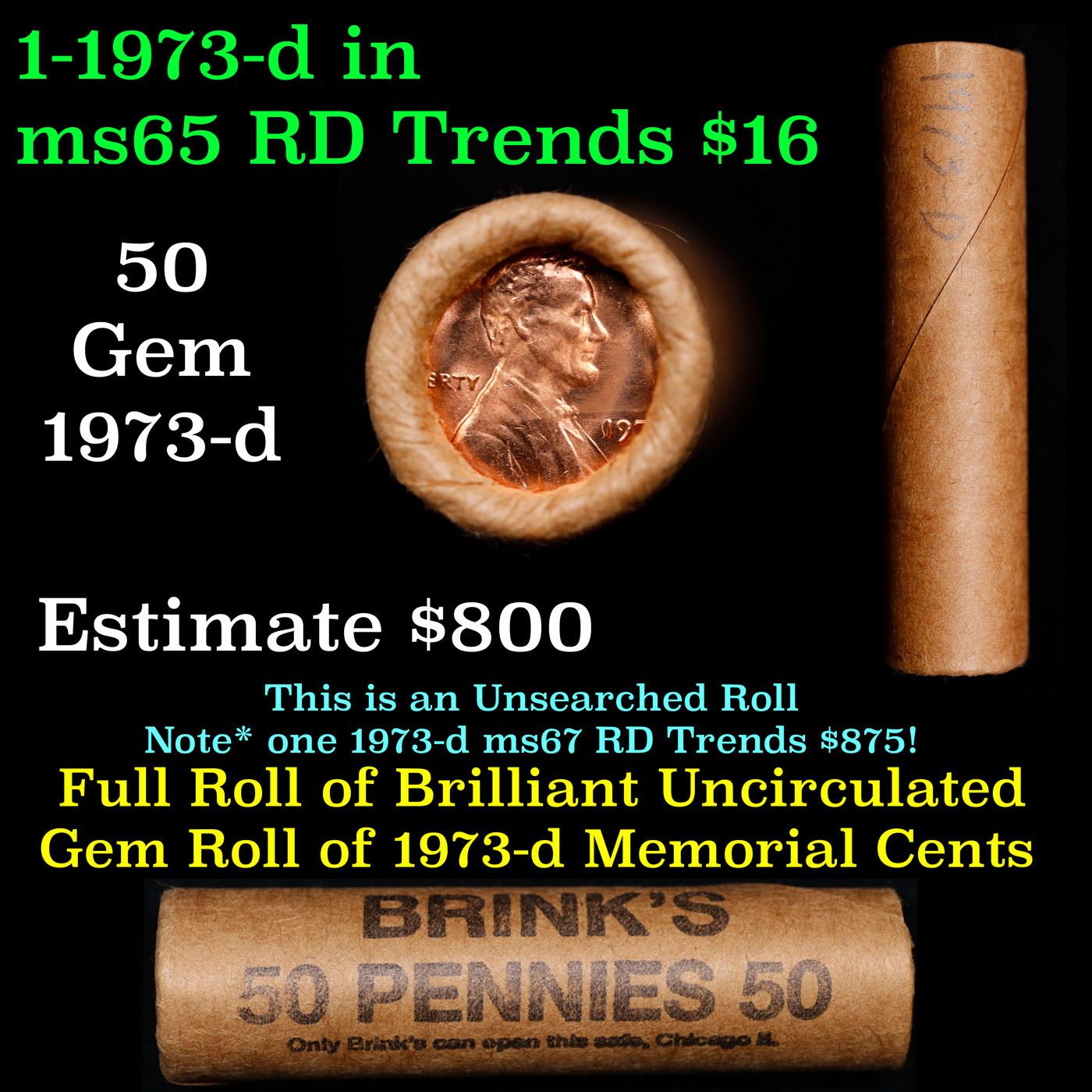 Shotgun Lincoln 1c roll, 1973-d 50 pcs Brandt Wrapper.. A terrific Shotgun roll of Lincoln cents. Most if not all coin should be cherry red.