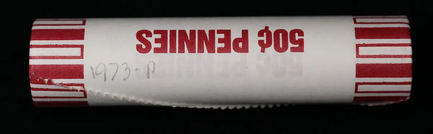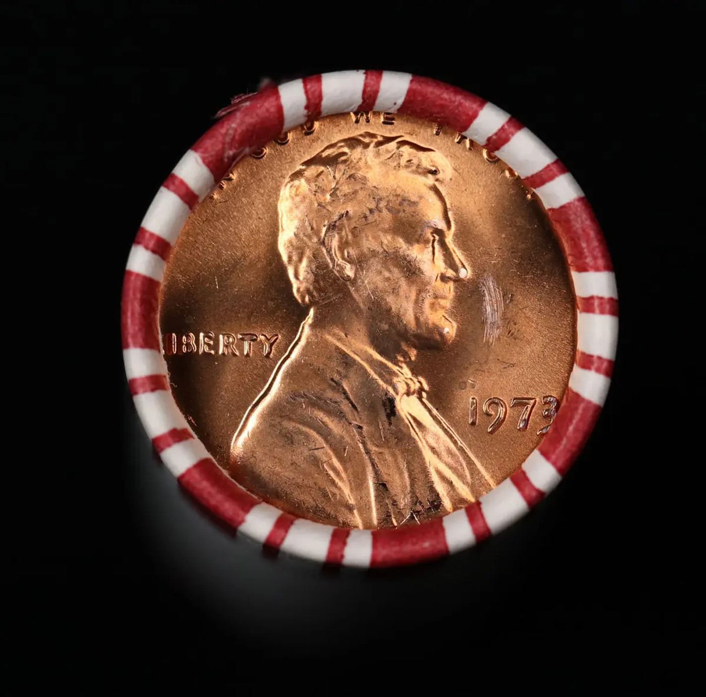 Shotgun Lincoln 1c roll, 1973-p 50 pcs Bank 50c Wrapper.. A terrific Shotgun roll of Lincoln cents. Most if not all coin should be cherry red.