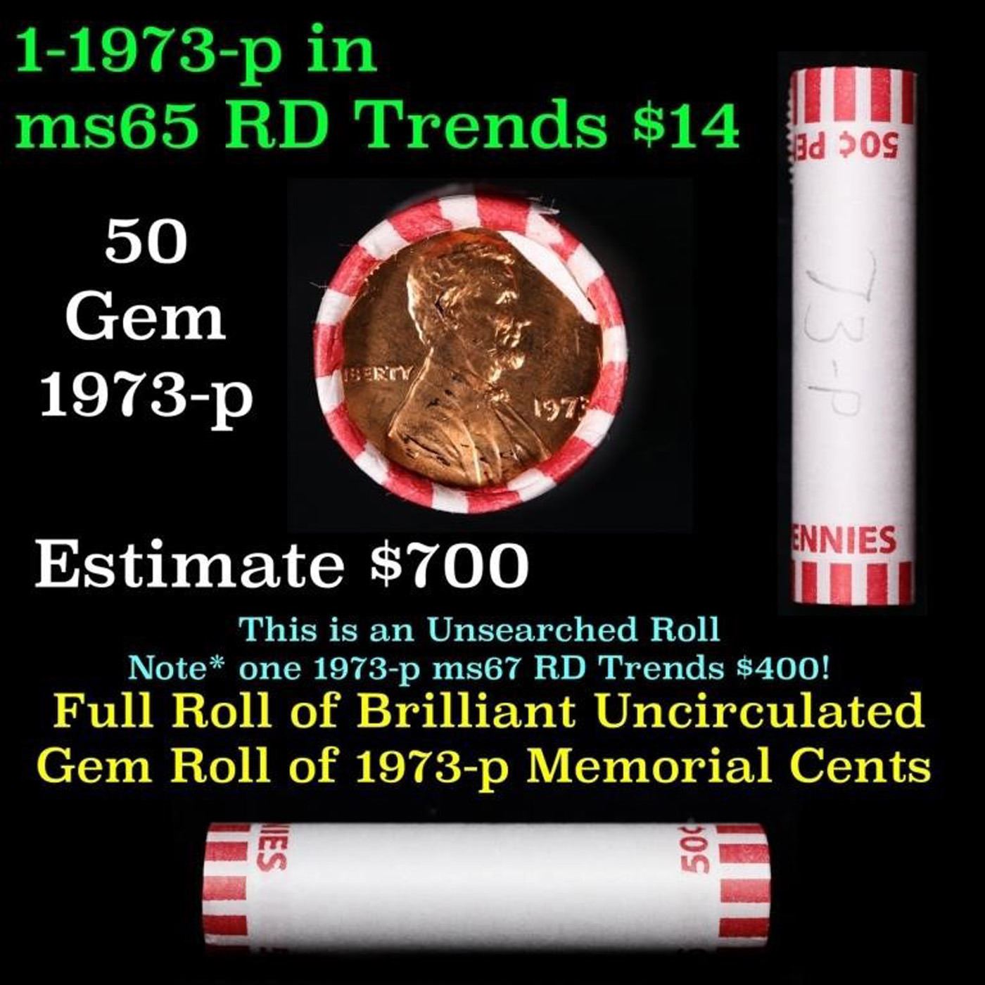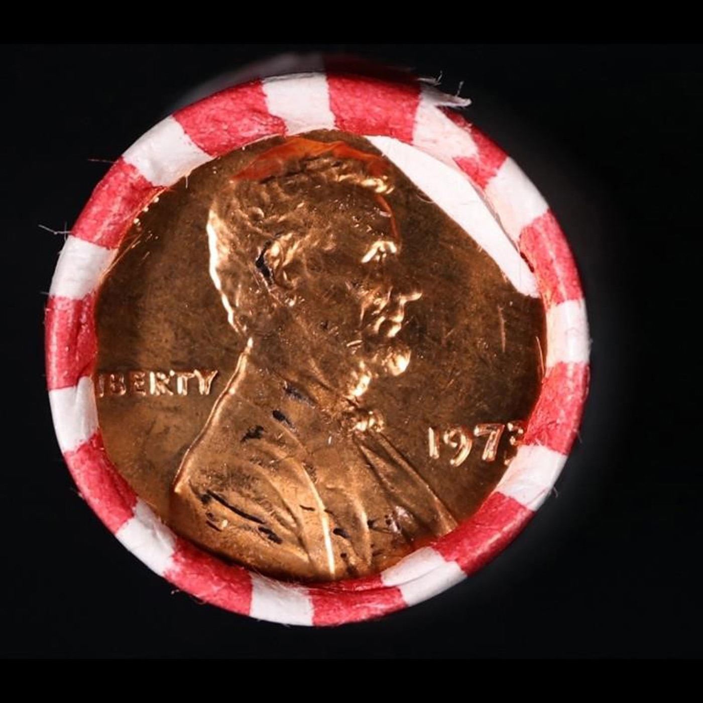 Shotgun Lincoln 1c roll, 1973-p 50 pcs Bank Wrapper.. A terrific Shotgun roll of Lincoln cents. Most if not all coin should be cherry red.