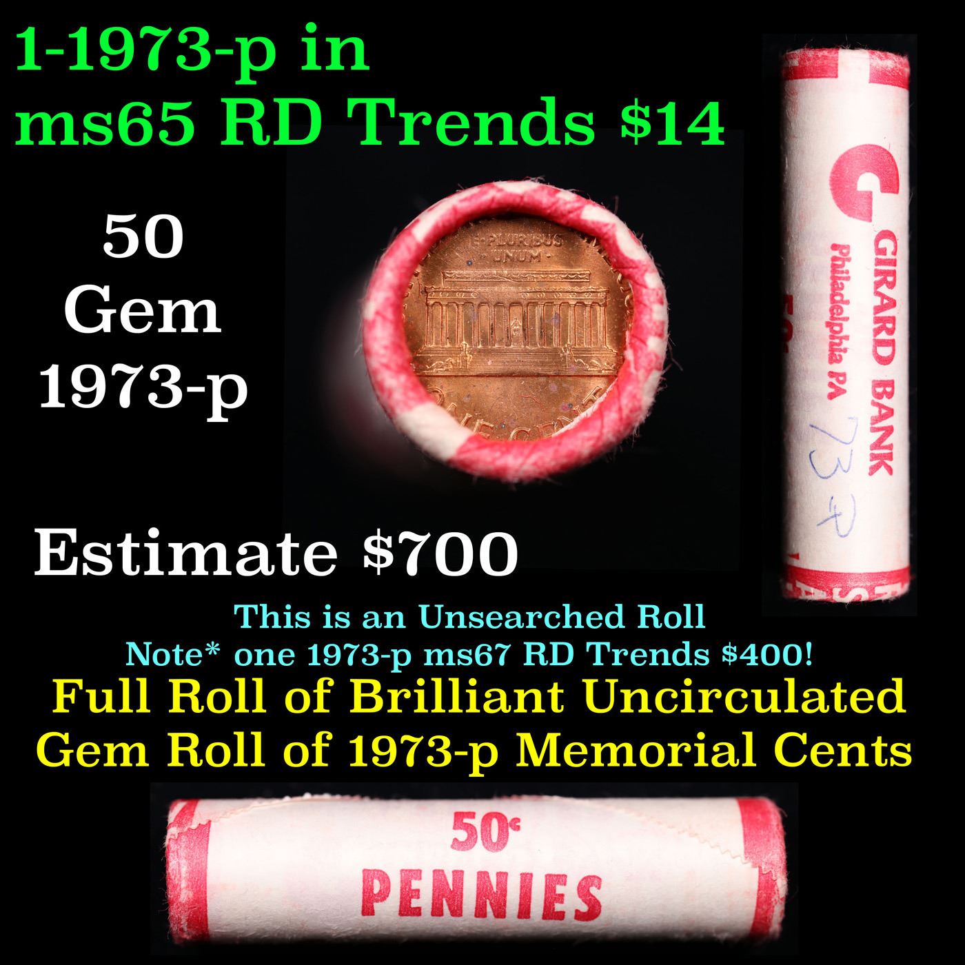 Shotgun Lincoln 1c roll, 1973-p 50 pcs Girard Bank Wrapper.. A terrific Shotgun roll of Lincoln cents. Most if not all coin should be cherry red. Trends ms65 rd $14