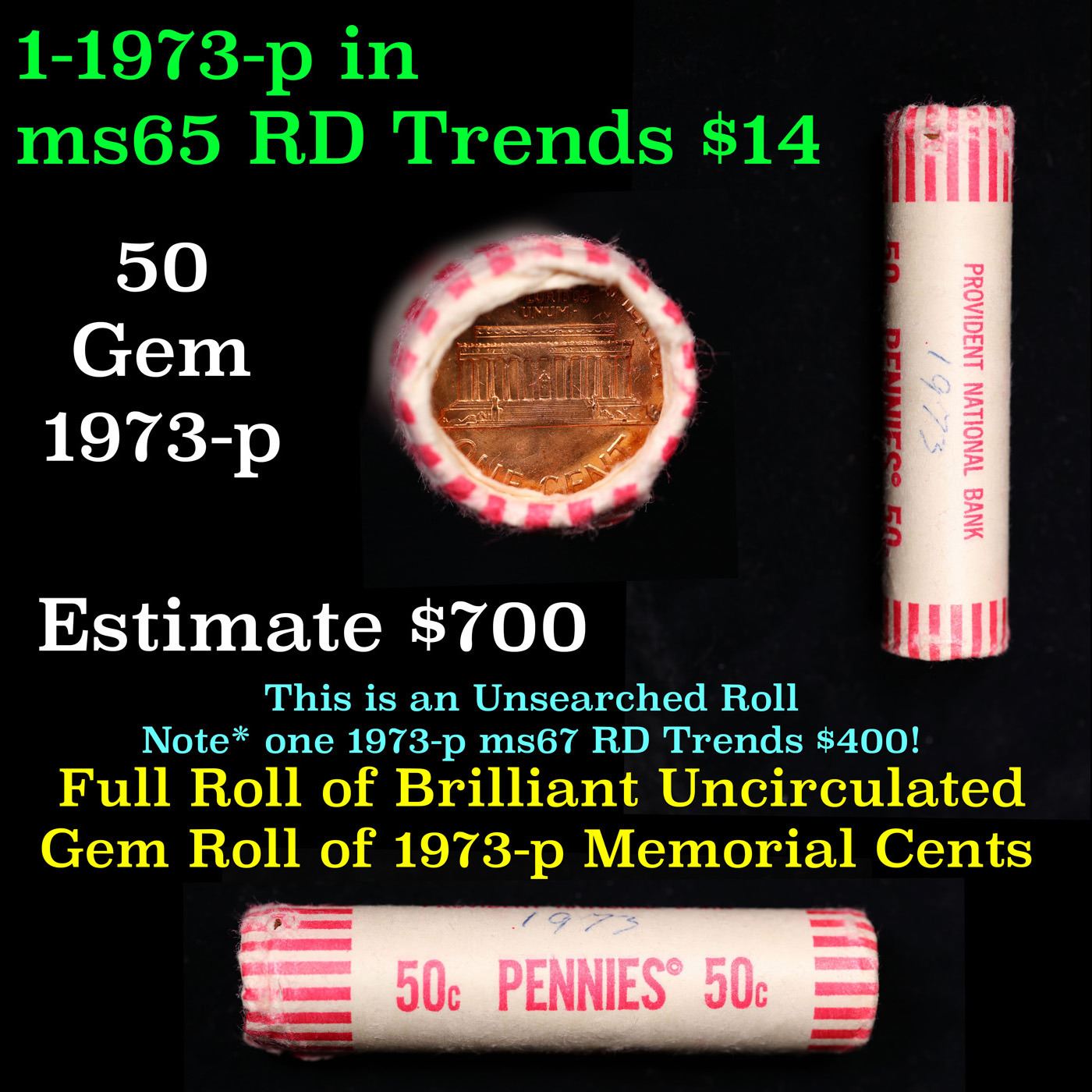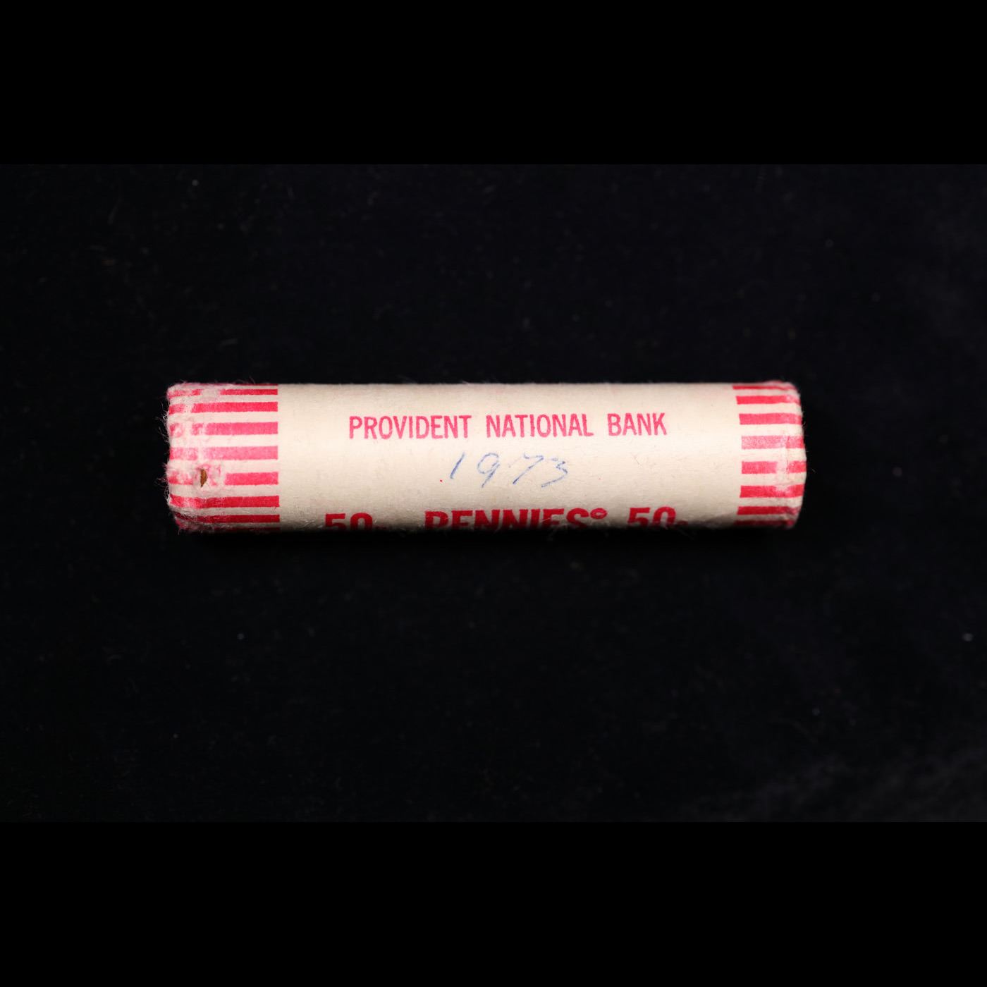 Shotgun Lincoln 1c roll, 1973-p 50 pcs Provident National Bank Wrapper.. A terrific Shotgun roll of Lincoln cents. Most if not all coin should be cherry red. Trends ms65 rd $14