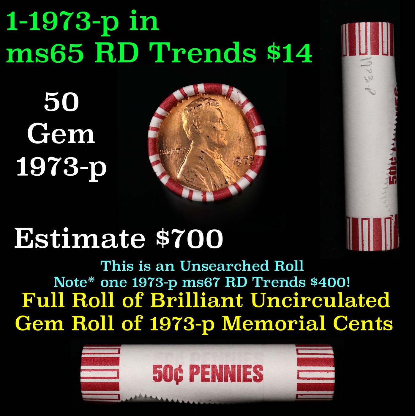 Shotgun Lincoln 1c roll, 1973-p 50 pcs Steel-Strong Wrapper.. A terrific Shotgun roll of Lincoln cents. Most if not all coin should be cherry red.