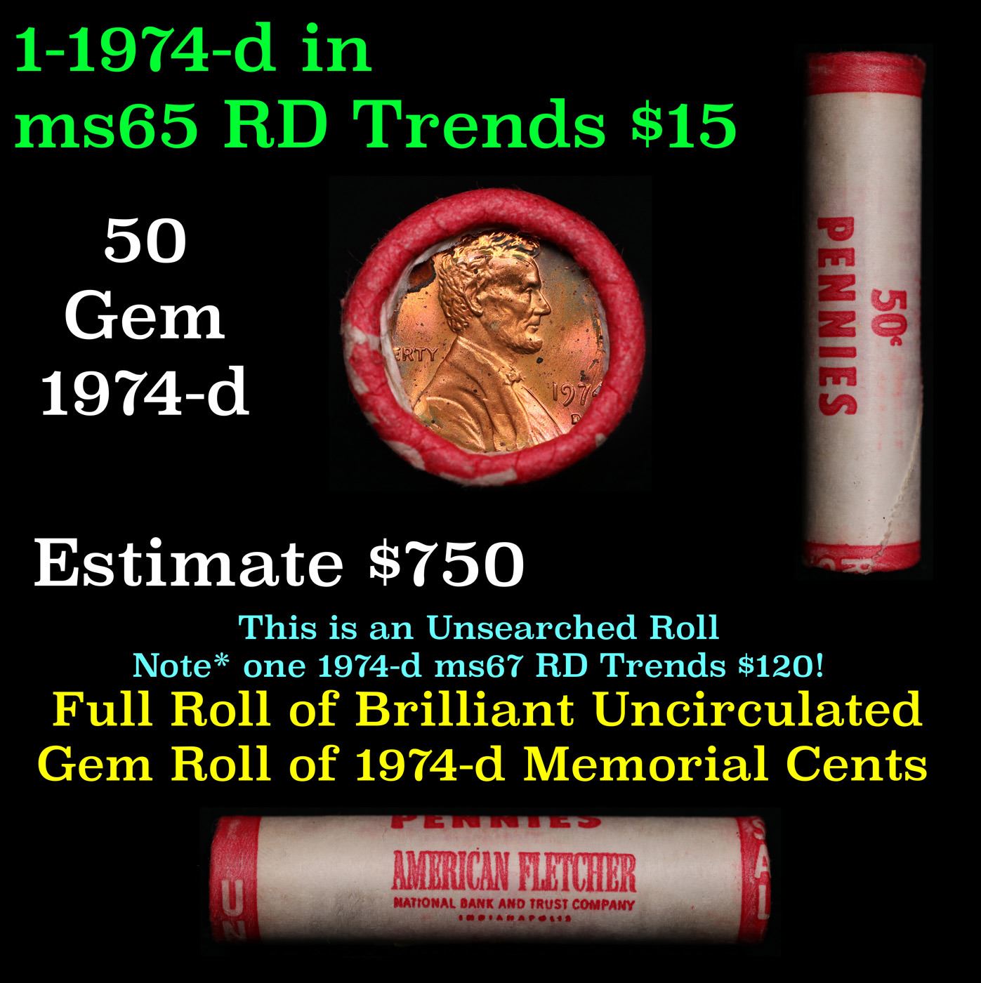 Shotgun Lincoln 1c roll, 1974-d 50 pcs American Fletcher Wrapper.. A terrific Shotgun roll of Lincoln cents. Most if not all coin should be cherry red.