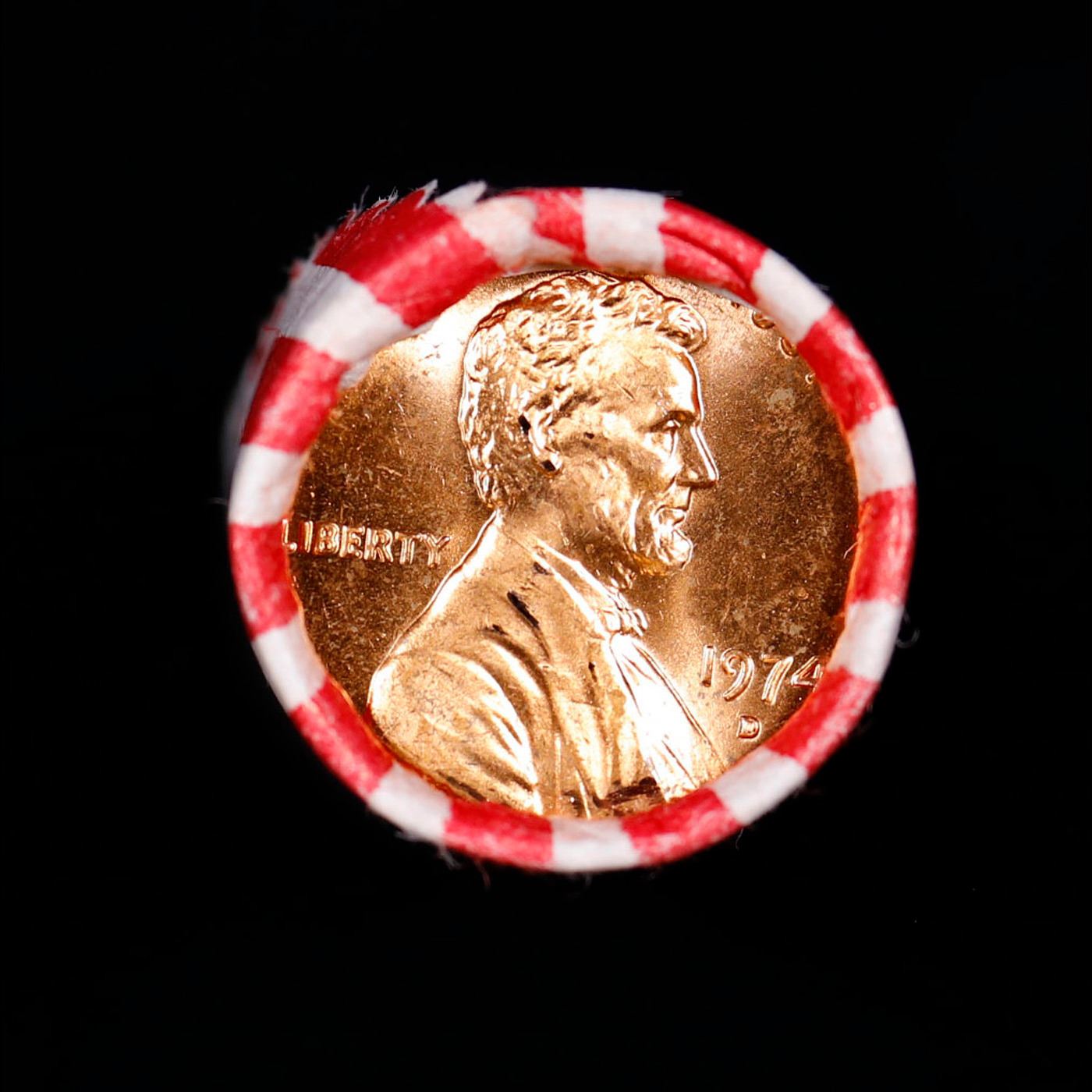 Shotgun Lincoln 1c roll, 1974-d 50 pcs Bank Wrapper.. A terrific Shotgun roll of Lincoln cents. Most if not all coin should be cherry red.