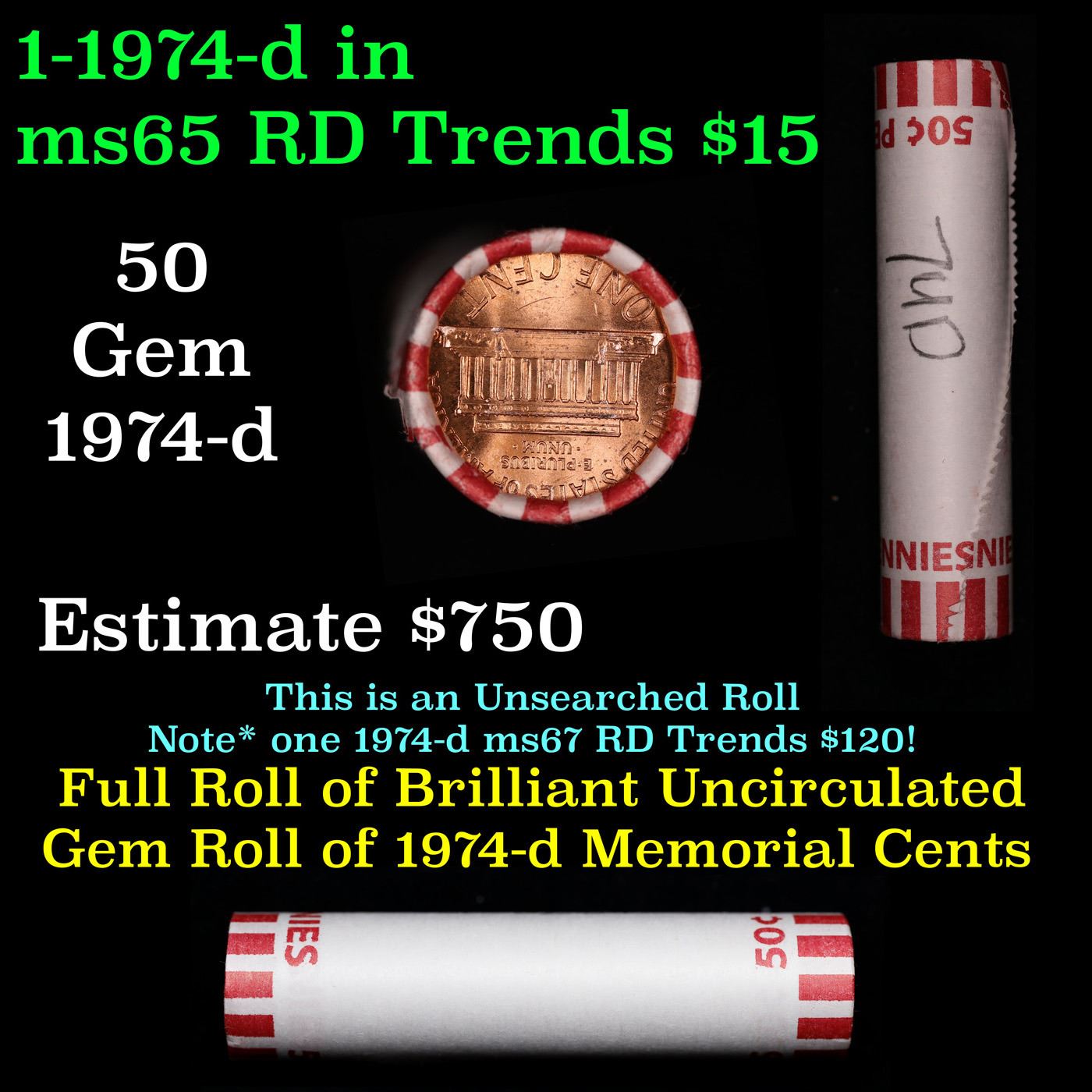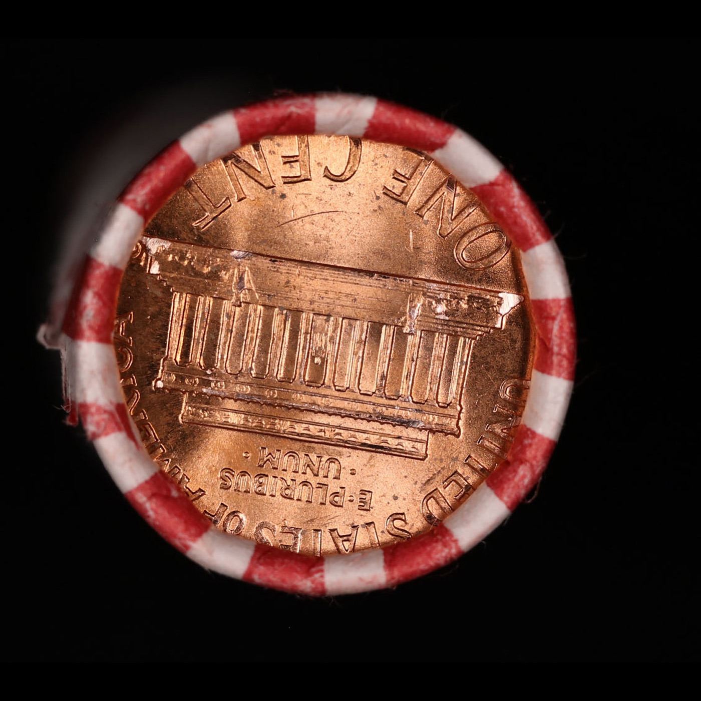 Shotgun Lincoln 1c roll, 1974-d 50 pcs Bank Wrapper.. A terrific Shotgun roll of Lincoln cents. Most if not all coin should be cherry red.