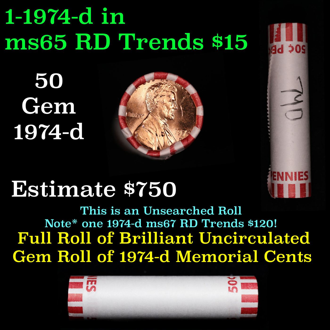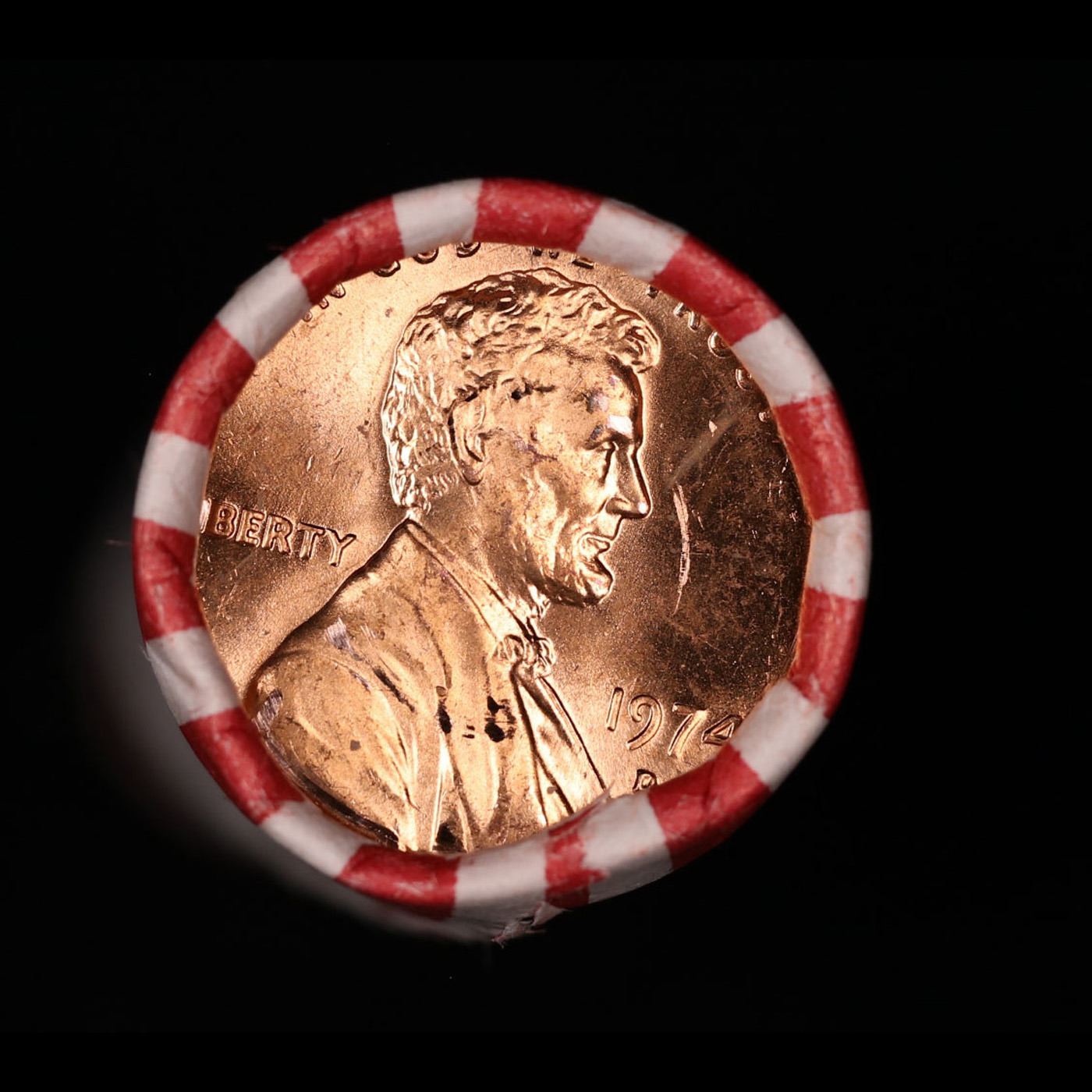 Shotgun Lincoln 1c roll, 1974-d 50 pcs Bank Wrapper.. A terrific Shotgun roll of Lincoln cents. Most if not all coin should be cherry red.