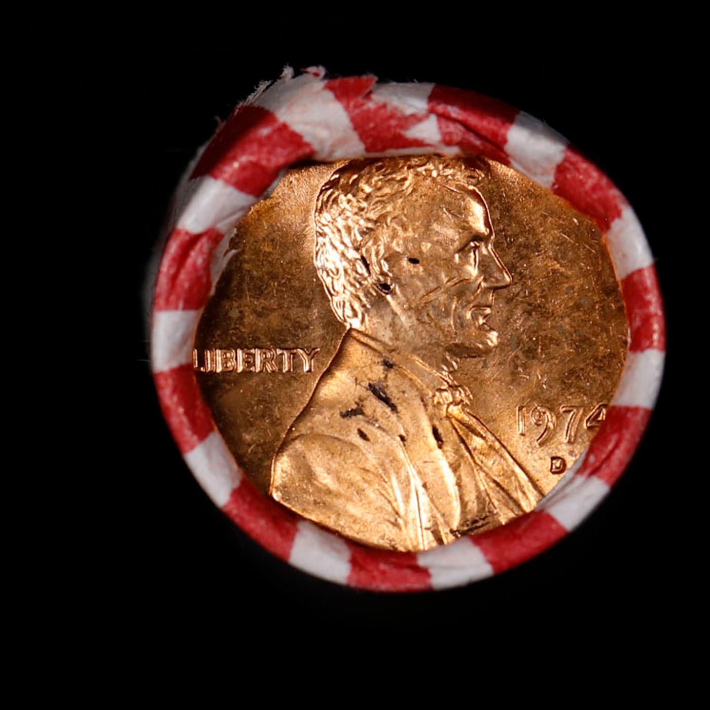 Shotgun Lincoln 1c roll, 1974-d 50 pcs Bank Wrapper.. A terrific Shotgun roll of Lincoln cents. Most if not all coin should be cherry red.