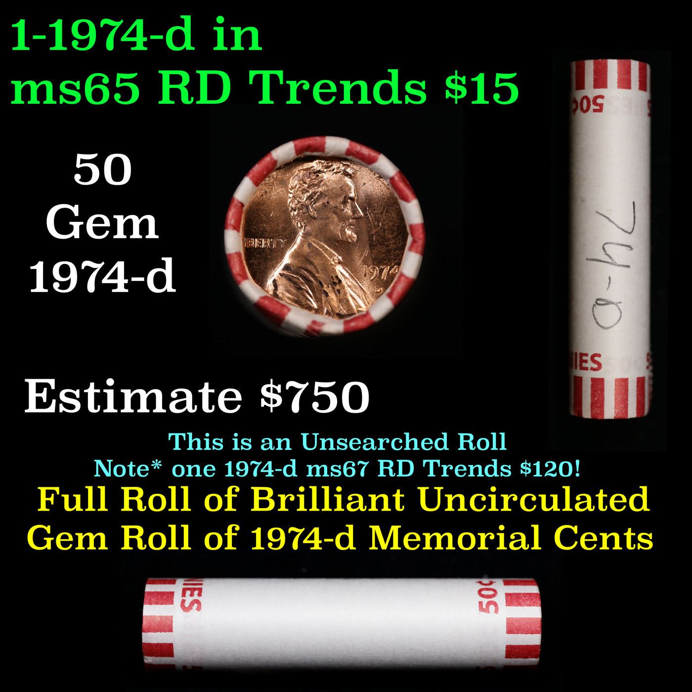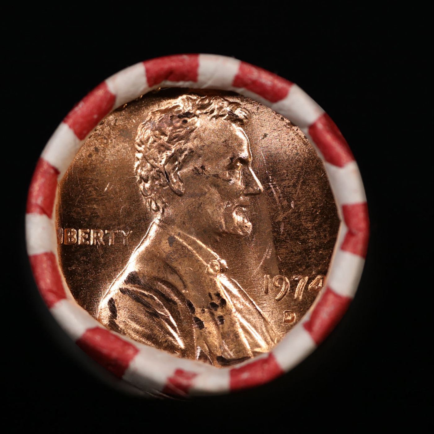 Shotgun Lincoln 1c roll, 1974-d 50 pcs Bank Wrapper.. A terrific Shotgun roll of Lincoln cents. Most if not all coin should be cherry red.